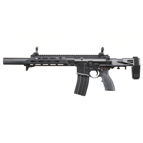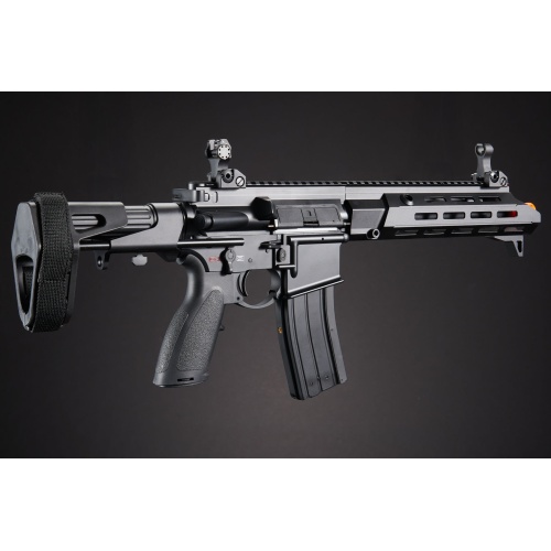 The Golden Eagle GBBR Airsoft Rifle w/ 11 Inch M LOK Handguard and Mock Suppressor is a compact, high performance gas blowback rifle designed for players who want realism, versatility, and modern styling on the field. Built with a durable black finish and enhanced with a short 11 inch M LOK piston driven style handguard, this rifle is perfect for CQB environments where agility and speed are key. The included mock suppressor adds a tactical aesthetic while also extending the rifle's profile for a balanced appearance. Outfitted with ambidextrous controls such as the fire selector, magazine release, and bolt catch, the rifle is user friendly for both left and right handed shooters. Flip up sights, adjustable for windage and elevation, provide reliable target acquisition, while the 4 position PDW stock with brace strap allows for quick adjustments and compact handling in tight spaces. Every element of this rifle is engineered to give players an advantage in competitive airsoft matches. The ergonomic pistol grip ensures comfort during extended use, while the enlarged trigger guard makes it glove friendly for year round play. An enhanced charging handle allows for smooth cycling and quick manipulations under pressure, and the 14mm CCW threaded barrel provides compatibility with muzzle devices and tracer units for customization. Combining realistic blowback action, modern ambidextrous controls, and a professional tactical design, this rifle is built to deliver both performance and immersion on the field. Available now, the Golden Eagle GBBR Airsoft Rifle with 11 Inch M LOK Handguard and Mock Suppressor is the perfect upgrade for players who demand reliability, accuracy, and cutting edge style from their airsoft guns.