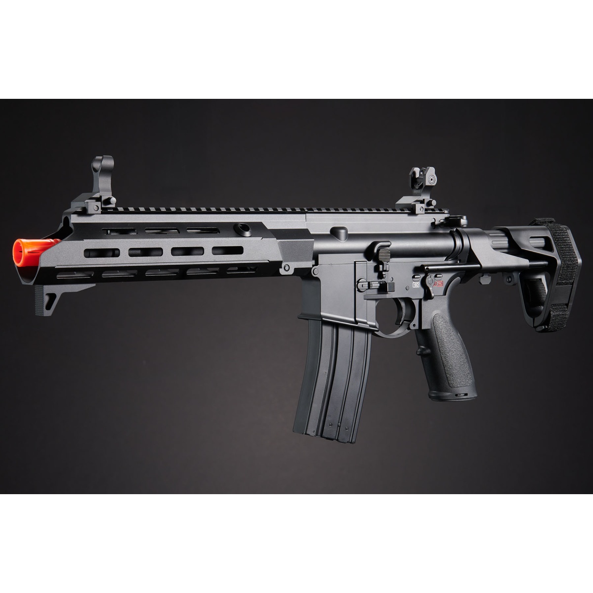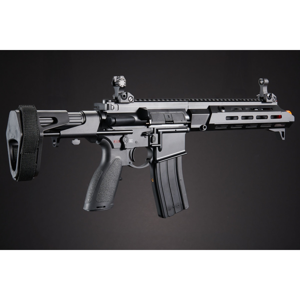 The Golden Eagle GBBR Airsoft Rifle w/ 11 Inch M LOK Handguard and Mock Suppressor is a compact, high performance gas blowback rifle designed for players who want realism, versatility, and modern styling on the field. Built with a durable black finish and enhanced with a short 11 inch M LOK piston driven style handguard, this rifle is perfect for CQB environments where agility and speed are key. The included mock suppressor adds a tactical aesthetic while also extending the rifle's profile for a balanced appearance. Outfitted with ambidextrous controls such as the fire selector, magazine release, and bolt catch, the rifle is user friendly for both left and right handed shooters. Flip up sights, adjustable for windage and elevation, provide reliable target acquisition, while the 4 position PDW stock with brace strap allows for quick adjustments and compact handling in tight spaces. Every element of this rifle is engineered to give players an advantage in competitive airsoft matches. The ergonomic pistol grip ensures comfort during extended use, while the enlarged trigger guard makes it glove friendly for year round play. An enhanced charging handle allows for smooth cycling and quick manipulations under pressure, and the 14mm CCW threaded barrel provides compatibility with muzzle devices and tracer units for customization. Combining realistic blowback action, modern ambidextrous controls, and a professional tactical design, this rifle is built to deliver both performance and immersion on the field. Available now, the Golden Eagle GBBR Airsoft Rifle with 11 Inch M LOK Handguard and Mock Suppressor is the perfect upgrade for players who demand reliability, accuracy, and cutting edge style from their airsoft guns.