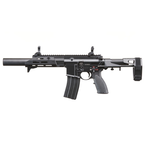 The Golden Eagle GBBR Airsoft Rifle w/ 7.5 Inch M LOK Handguard and Mock Suppressor is a compact, high performance gas blowback rifle designed for players who want realism, versatility, and modern styling on the field. Built with a durable black finish and enhanced with a short 7.5 inch M LOK piston driven style handguard, this rifle is perfect for CQB environments where agility and speed are key. The included mock suppressor adds a tactical aesthetic while also extending the rifle's profile for a balanced appearance. Outfitted with ambidextrous controls such as the fire selector, magazine release, and bolt catch, the rifle is user friendly for both left and right handed shooters. Flip up sights, adjustable for windage and elevation, provide reliable target acquisition, while the 4 position PDW stock with brace strap allows for quick adjustments and compact handling in tight spaces. Every element of this rifle is engineered to give players an advantage in competitive airsoft matches. The ergonomic pistol grip ensures comfort during extended use, while the enlarged trigger guard makes it glove friendly for year round play. An enhanced charging handle allows for smooth cycling and quick manipulations under pressure, and the 14mm CCW threaded barrel provides compatibility with muzzle devices and tracer units for customization. Combining realistic blowback action, modern ambidextrous controls, and a professional tactical design, this rifle is built to deliver both performance and immersion on the field. Available now, the Golden Eagle GBBR Airsoft Rifle with 7.5 Inch M LOK Handguard and Mock Suppressor is the perfect upgrade for players who demand reliability, accuracy, and cutting edge style from their airsoft guns.