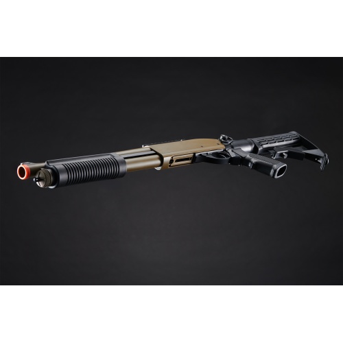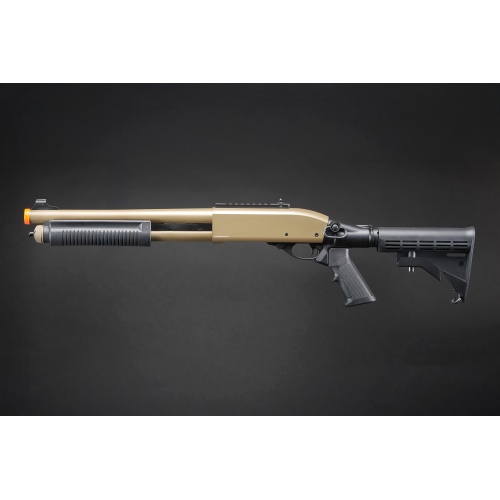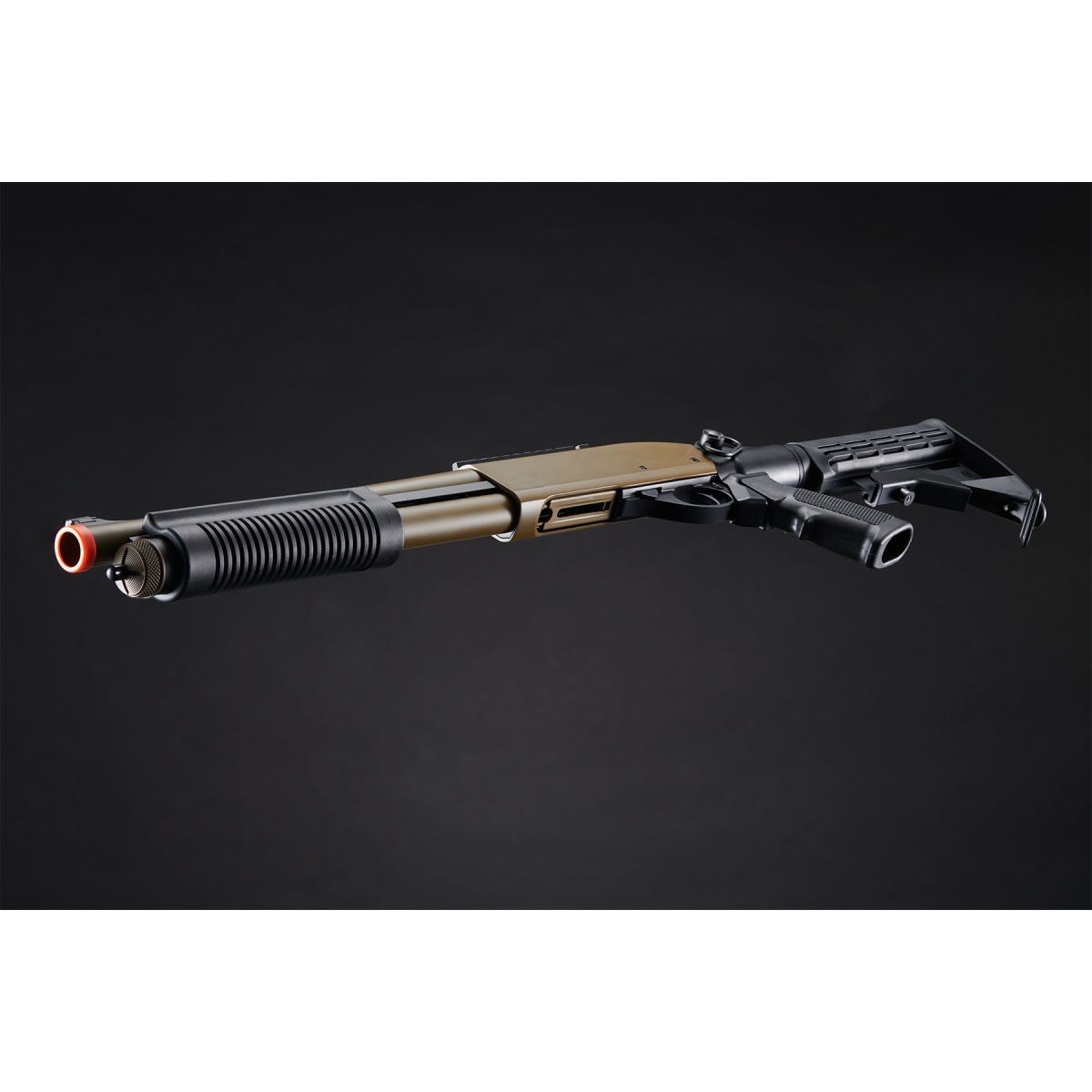 For enhanced adaptability, the M8871 is equipped with a six-position M4-style crane stock, allowing players to adjust the length of pull for maximum comfort and maneuverability. The A2-style pistol grip offers a firm and ergonomic hold, making it easy to handle in high-intensity skirmishes. One of its standout features is the rapid-fire function, enabling continuous firing by cycling the pump while holding the trigger, perfect for aggressive playstyles. With a muzzle velocity of 260-300 FPS using 0.20g BBs, this shotgun delivers a balance of power and field-ready performance. Available in black or tan, the M8871 stands out with a tactical, modern design. Whether for CQB battles, tactical training, or serious airsoft competition, this CO2-powered shotgun is an excellent choice for players seeking durability, accuracy, and fast-paced action.