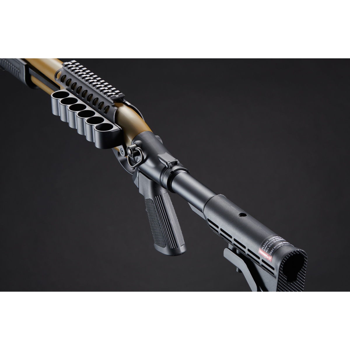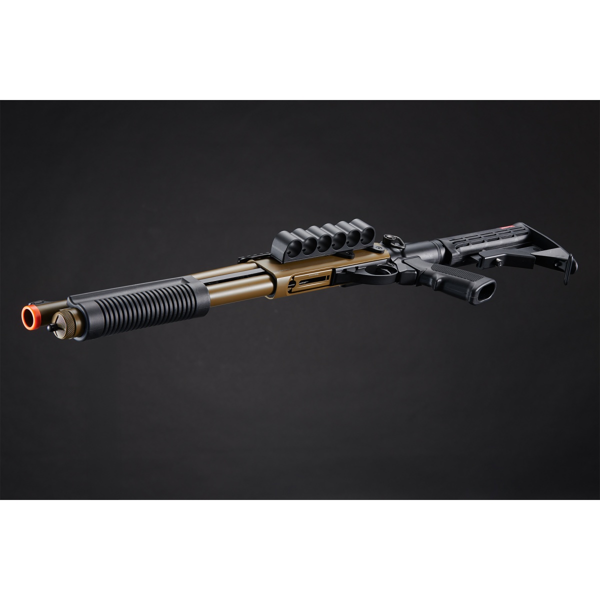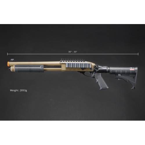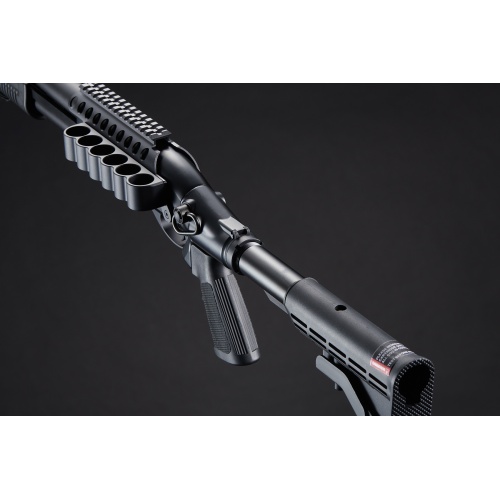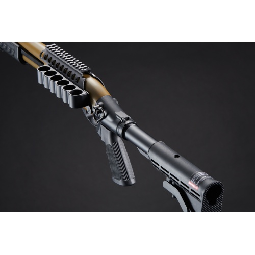Designed for comfort and control, the M8873 includes a six-position M4-style crane stock, allowing for an adjustable length of pull to fit various playstyles. The A2-style pistol grip provides a familiar and ergonomic hold, ensuring maximum stability and handling. This shotgun also features a rapid-fire function, enabling continuous firing by cycling the pump while holding the trigger, making it a deadly choice in fast-paced, high-intensity skirmishes. With a muzzle velocity of 320 FPS using 0.20g BBs, it delivers consistent and reliable power, making it an ideal shotgun for competitive airsoft matches, tactical training, or MilSim scenarios. The additional mount for storing six extra rounds ensures quick reloads in the heat of battle. Available in black or tan, the Golden Eagle M8873 combines high performance, modern tactical enhancements, and realistic operation, making it a must-have for airsoft enthusiasts seeking a top-tier gas shotgun.