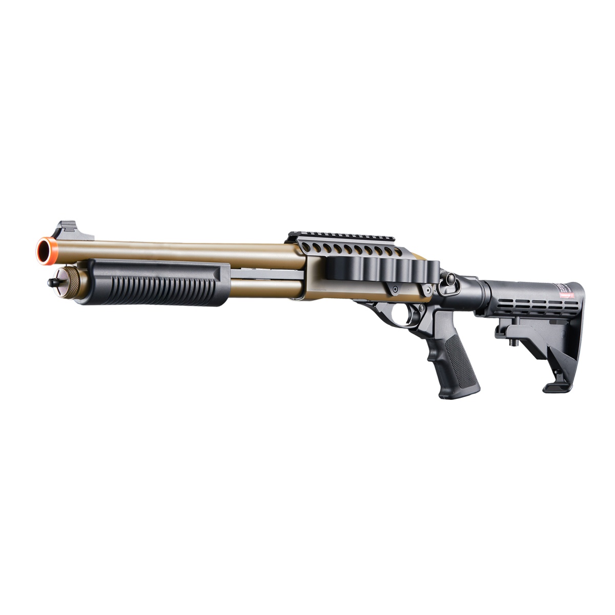 Golden Eagle M8873 3/6-Shot Pump Action CO2 Airsoft Shotgun w/ Optic Rail & M4 Crane Stock - TAN