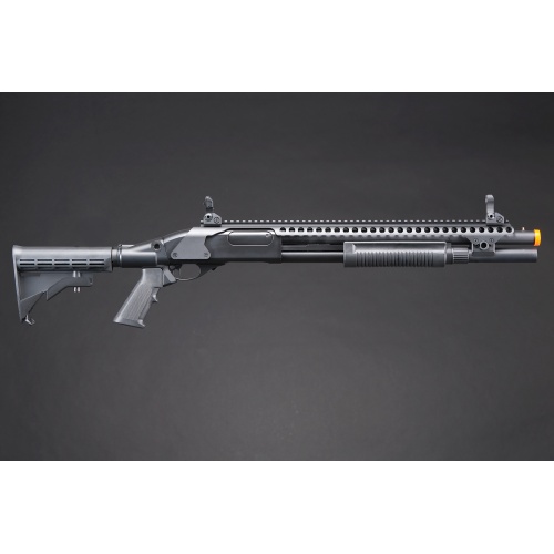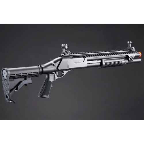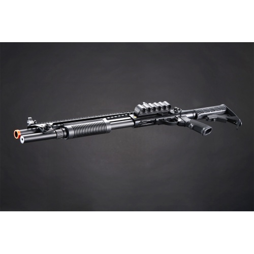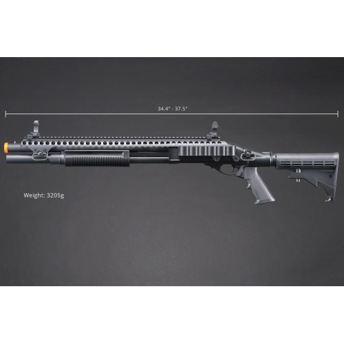 Golden Eagle M8874 3/6-Shot Pump Action Gas Airsoft Shotgun w/ Flip Up Sights, Picatinny Rail & M4 Crane Stock - BLACK