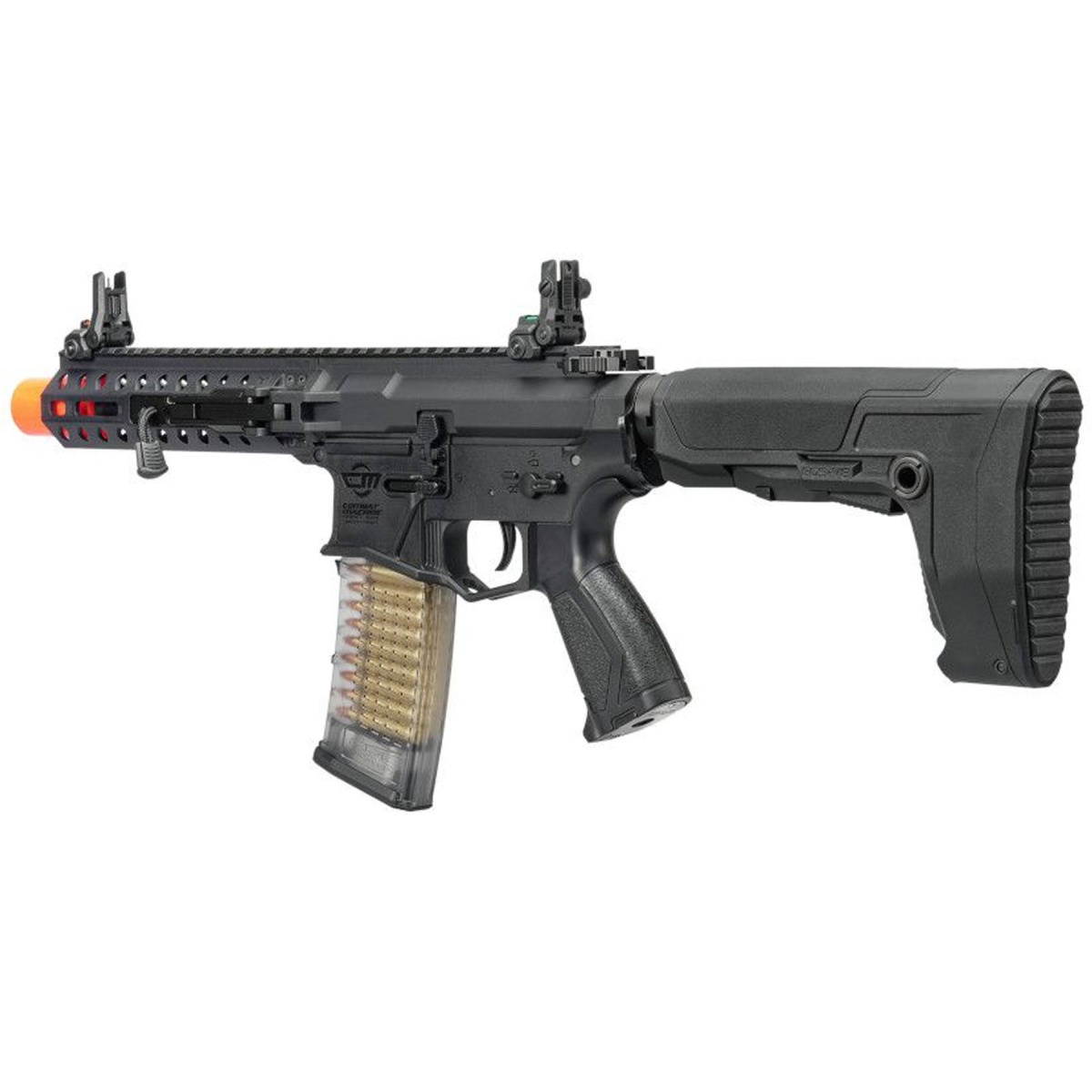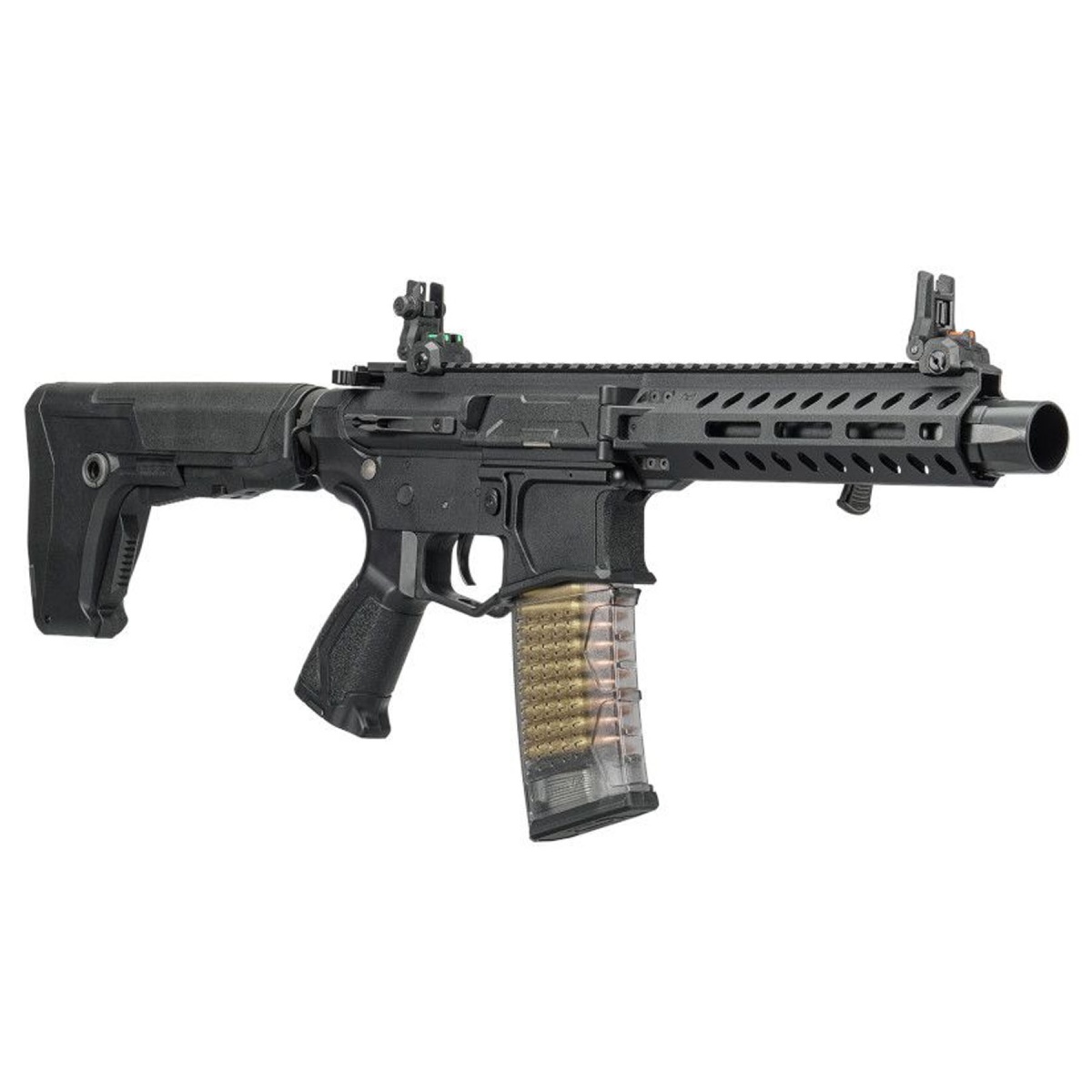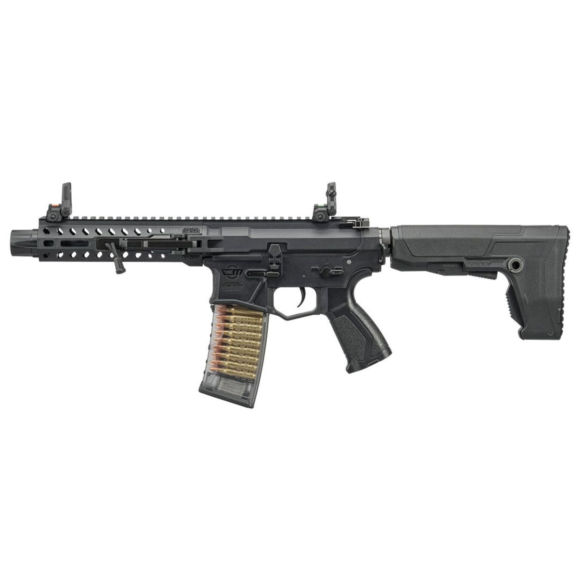 Internally, the upgradable Version 2 MIG gearbox provides a reliable and proven foundation for long term durability and future performance upgrades. Ambidextrous controls including the fire selector switch and magazine release ensure smooth operation for left or right handed shooters. The GOS-V8 adjustable stock enhances ergonomics, delivering a stable shoulder fit that supports controlled follow up shots. Dual profile fiber optic flip up front and rear sights allow for fast target acquisition, while the included 30 round mid cap magazine promotes dependable feeding and a realistic loadout. Finished in black, the G&G CM16 GMS STRIKER Folding MLOK M4 AEG stands out as a modern, programmable airsoft gun designed for players who demand compact handling, responsive electronics, and trusted G&G build quality in one streamlined package.