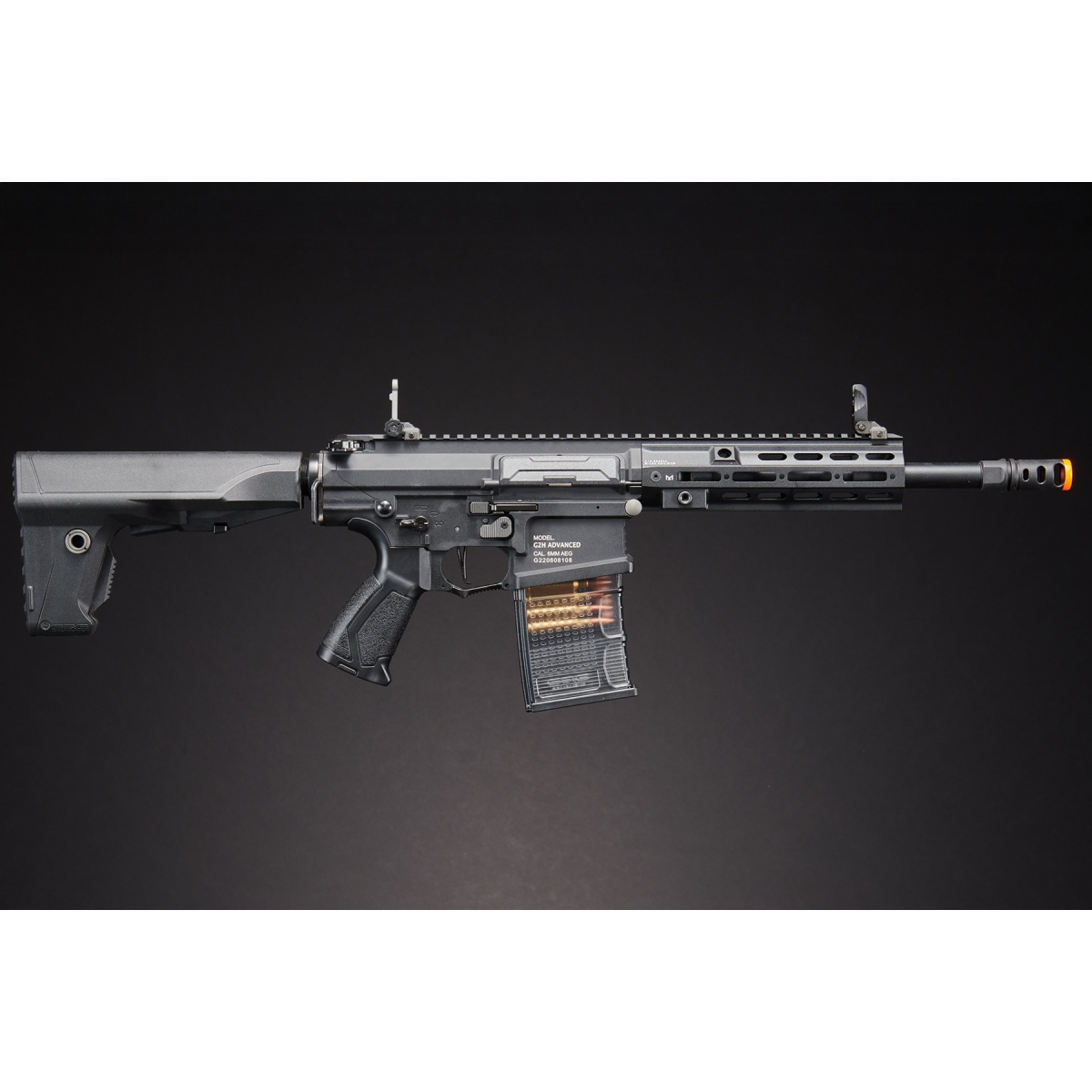 The TR16 SBR 308 MK1 is another great addition to G&G's line of premium airsoft guns that are in the market. This model comes with a larger 308 style magazine for those that want a beefier set up. The receiver and M-LOK rail system are constructed out of metal for a sturdy and solid build. The M-LOK rail is capable of hosting rail segments to attach different accessories like a vertical grip, flashlight or anything else you may need. The airsoft gun has a left hand friendly capability with the ambidextrous charging handle, fire selector, rear sling mount and magazine release. The ergonomic six position crane stock holds the battery compartment and has a rubber pad for extra comfort on shouldering the airsoft gun. The bolt locks back to adjust the hop up of the airsoft gun with ease. A quick change spring system allows you to swap out the spring to manage the FPS you desire. Switch the spring to reach the 350 FPS limit required for most close combat fields! The electronic trigger unit is now 50% reduced in size compared to its predecessor. This version's electronic trigger unit features an electric cut off when no magazine is inserted. G&G has include a proprietary mid capacity magazine that cuts off the electricity when there are no more BBs left. There is also a micro speaker that beeps when there is a low battery or gearbox issue that is not allowing you to shoot the airsoft gun properly. No additional tools are needed to adjust the full auto fire to 3 or 5 round burst with the assistance of the installed G2 MOSFET. Internally, the gearbox shell is reinforced with height and thickness to hold up through tougher usage over time. There is a redesigned bevel gear that lowers power consumption and has less heat generated to keep the stress to a minimum. The air nozzle and thicker padded cylinder come with a double o-ring to keep the compression tight for better air flow and consistent FPS. G&G has also installed a cover near the top motor area so that the pinion gear does not tear up the wires. Overall, the G&G TR16 MBR 308SR G2 M4 packs a ton of features that will withstand plenty of shots within the years to come.