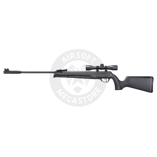 The UMAREX Prymex .22 Caliber Gas Piston Break Barrel Air Rifle in Black is a versatile choice for plinking, pest control, or small game hunting. Powered by a T.N.T gas piston, it delivers smooth, reliable shots with velocities up to 820 FPS with lead pellets and 900 FPS with alloy pellets. This .22 caliber rifle features a break barrel action, fiber optic iron sights for accuracy, and an 11mm dovetail mount for easy scope customization. Weighing 6.17 lbs and equipped with an 18.9-inch barrel, it includes a 4x32 scope for enhanced targeting, offering power and precision at an affordable price.