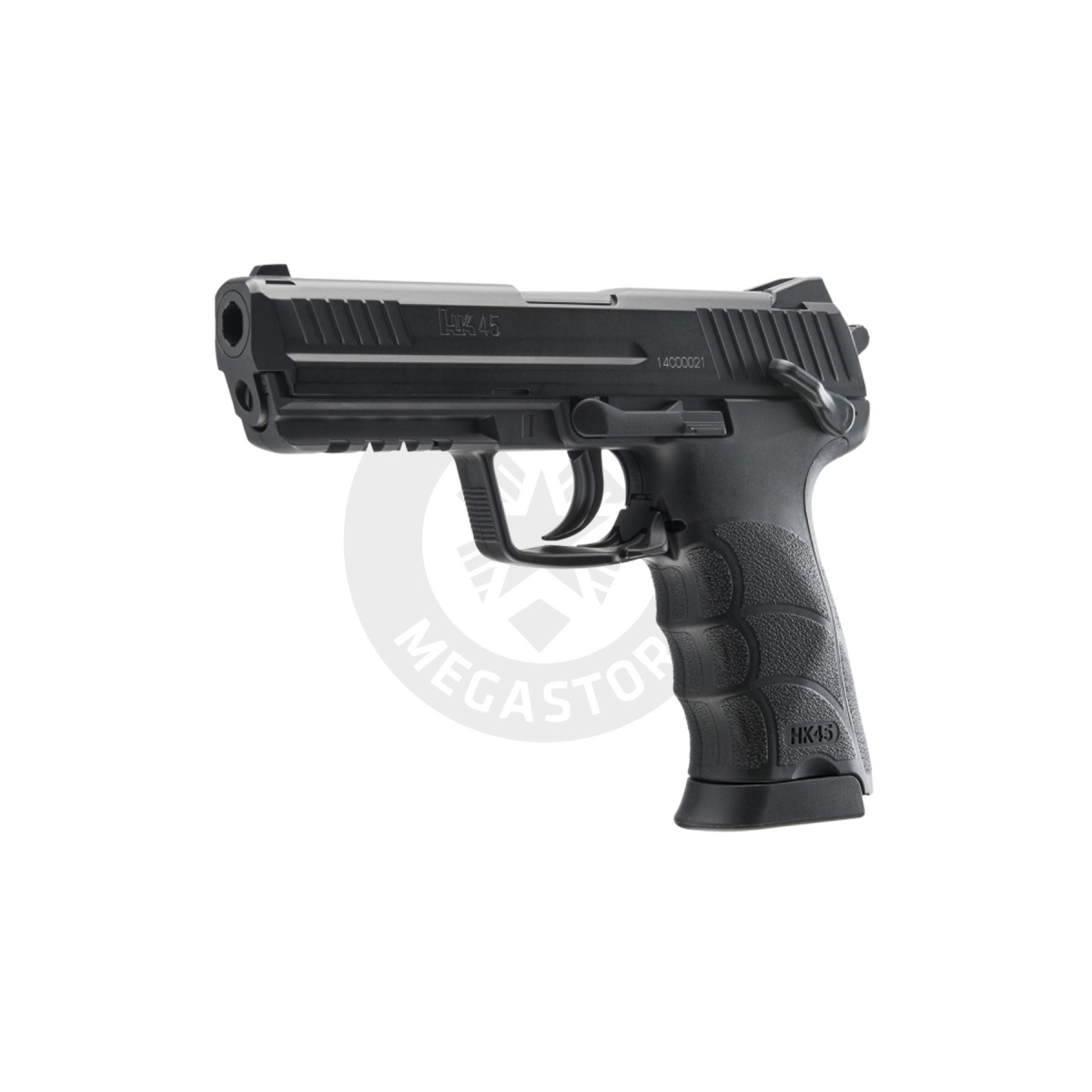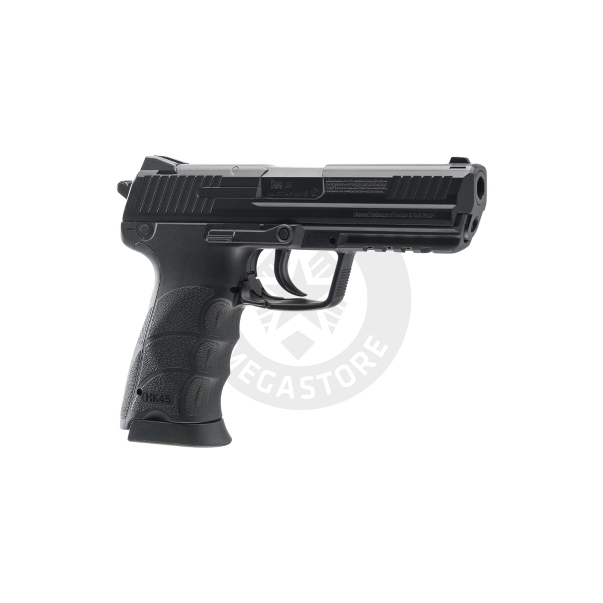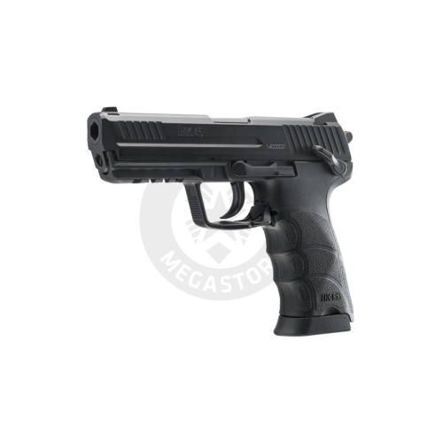 Explore the Heckler & Koch HK45 GBB CO2 Air Pistol in Black, available at Airsoft Megastore! This .177 caliber (Metal Pallet) BB pistol shoots at 400 FPS with a 22-round drop-free magazine. An authentic licensed replica of the HK45, it features semi-auto operation and is powered by 12g CO2. Perfect for enthusiasts seeking precision and realism, it has a standard action and bears the licensed trademark of Heckler & Koch GmbH. Whether for target shooting or collection, the HK45 offers reliability and performance. Enhance your shooting experience with this high-quality CO2-powered air pistol.