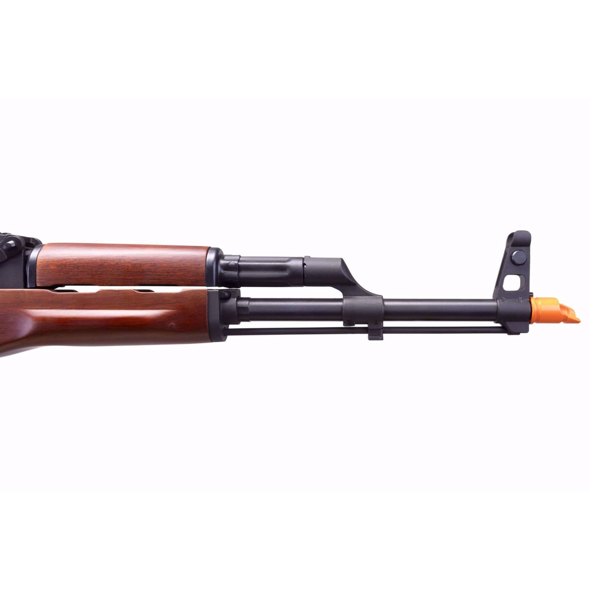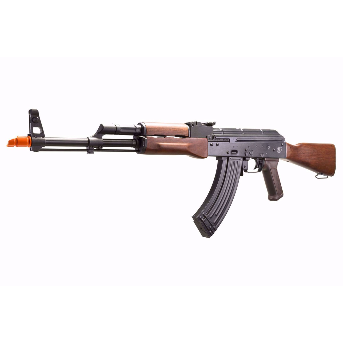 The E&L AKM Platinum AEG 6mm Airsoft Rifle w PT 2.0 ETU V3 in black and wood blends classic AKM aesthetics with modern electric performance for players who value realism and reliability. Built on E&Ls Platinum series foundation, this AEG features a durable metal frame paired with authentic brown catalpa wood furniture on the stock and foregrips, delivering the solid weight and visual presence expected from an AKM airsoft rifle. Semi auto and full auto fire modes give you flexibility on the field, while adjustable front and rear sights help you quickly align shots in changing conditions. Shooting at approximately 345 FPS, this rifle is well suited for outdoor play and mixed field environments. The adjustable hop up allows precise tuning of BB trajectory, improving consistency and effective range during longer engagements.