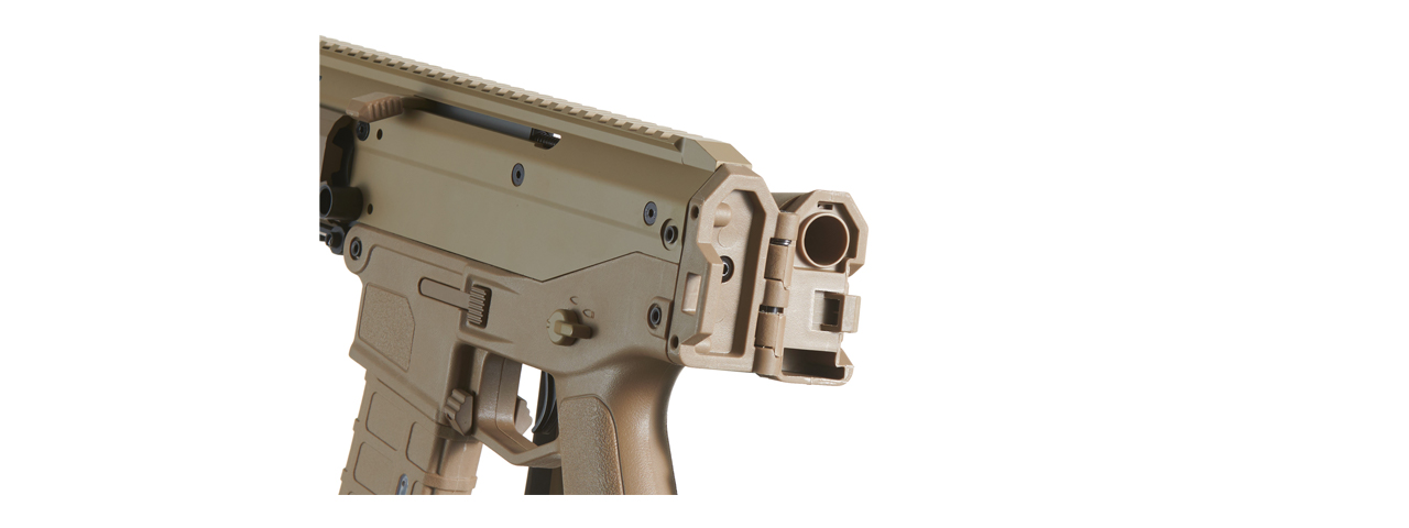 - Foldable stock that can be folded and locked to have this rifle be shortened for CQB environments for easier storage