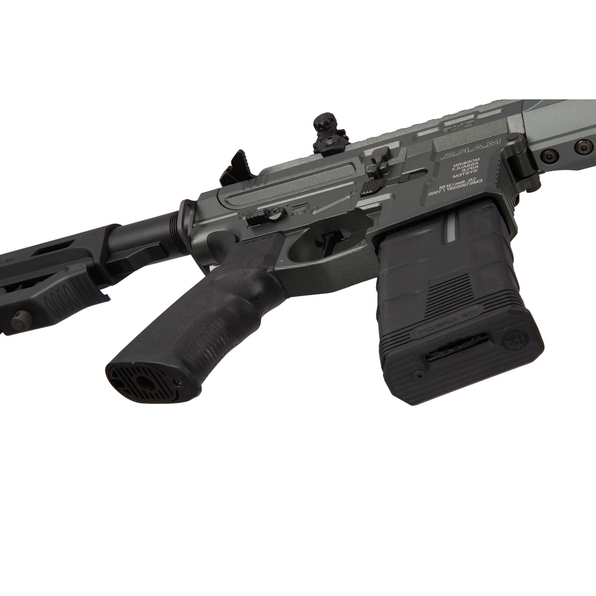 The stock does not only to the right side and features a 6-setting adjustment but also has an adjustable cheek pad. Inside is the room for the battery storage and a fuse. Noteworthy is also the fact that the replica features an electric blow back system that sets the bolt in motion when firing, The replica was created with both left and right handed users in mind. The fire mode selector and magazine release button are both double sided and the charging handle can be attached either on the left or right side.