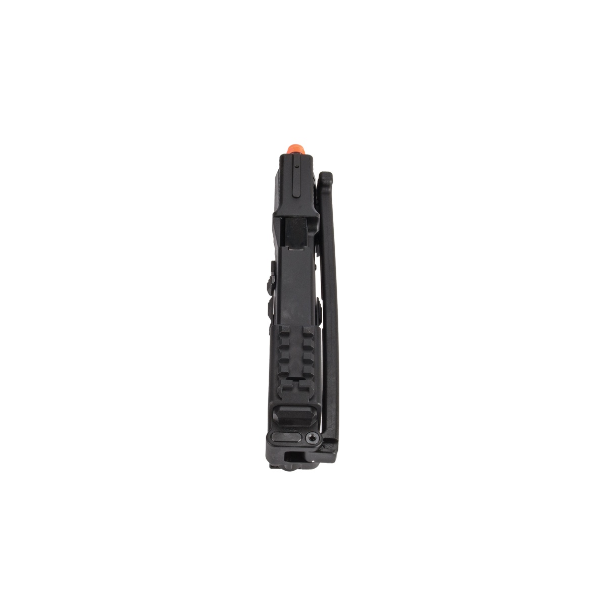 The USW A1 is fully customizable with a non-reciprocating optics rail mount on the upper and a lower 20mm rail for flashlights, lasers or other accessories. Further flexibility is provided by a threaded 14mm outer barrel to allow tracer units or barrel extension tubes to be fitted to the USW A1. To use the USW A1 as a PDW the stock is rapidly deployed by depressing the stock locking button and allowing the spring-loaded stock to swing out to assist accurate shooting at longer ranges. The USW A1 also features a fully adjustable hop up unit able to lift most BB weights and provide round on round accuracy for a fantastic shooting experience.