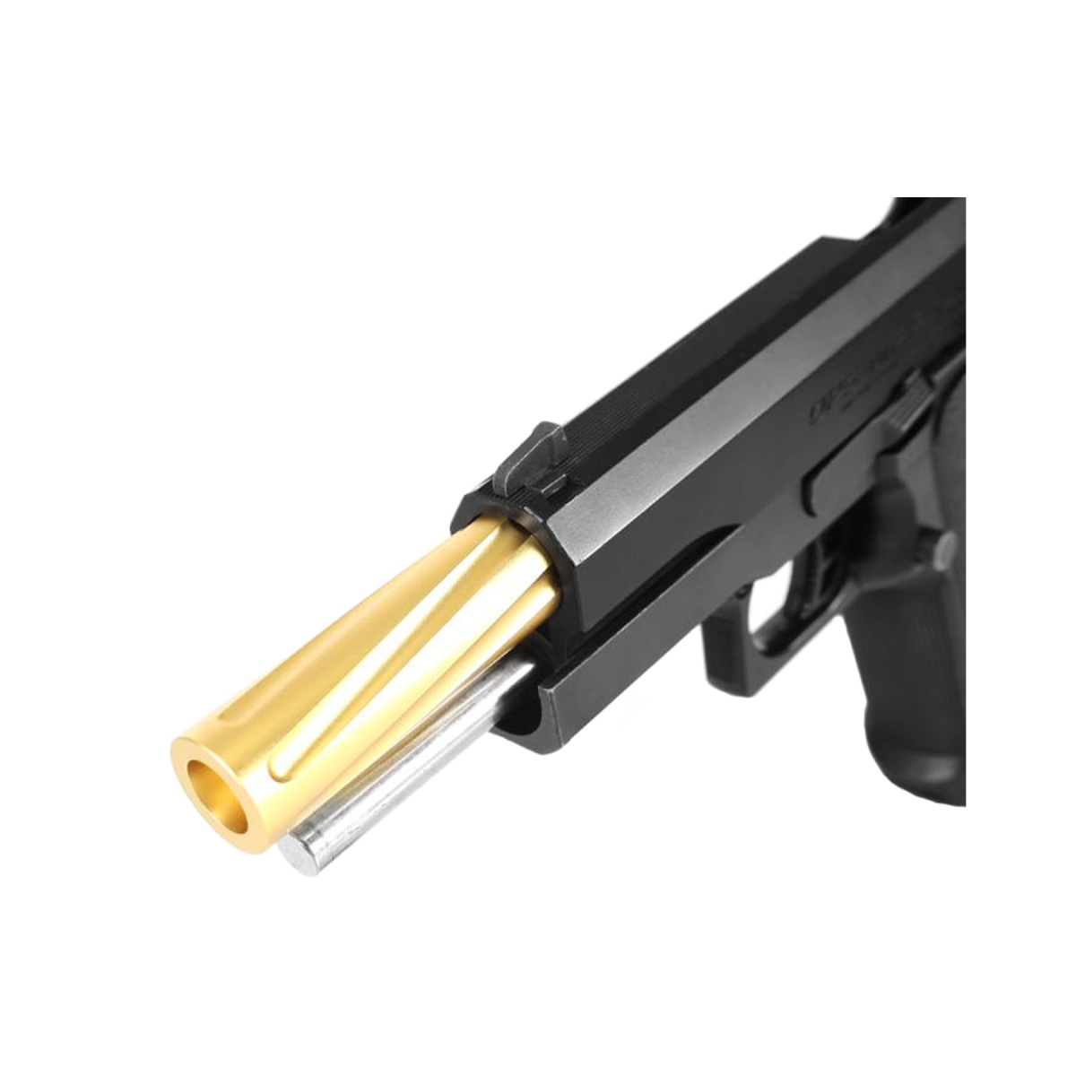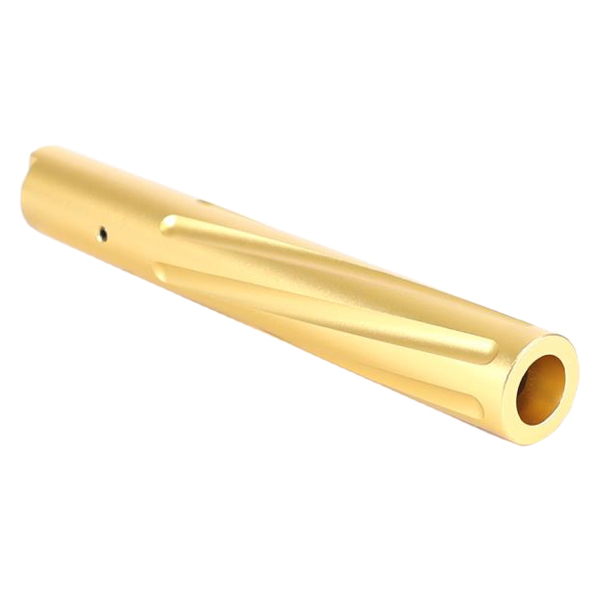 Introducing the Laylax Aluminum Hi-Capa 5.1 Fluted Outer Barrel in striking Gold color! Experience unrivaled stability and improved accuracy with its highly rigid aluminum alloy construction, providing a non-recoil effect. Designed to reduce shake, this barrel enhances your shooting performance. The fluted twist not only adds a unique aesthetic appeal but also makes it lighter for effortless maneuverability. With Laylax's renowned Japanese engineering, this product guarantees exceptional manufacturing quality and precise tolerances. Elevate your airsoft game with this must-have accessory, trusted by enthusiasts for over 20 years. Visit Airsoft Megastore now to get your hands on this high-performance barrel and achieve unparalleled precision.