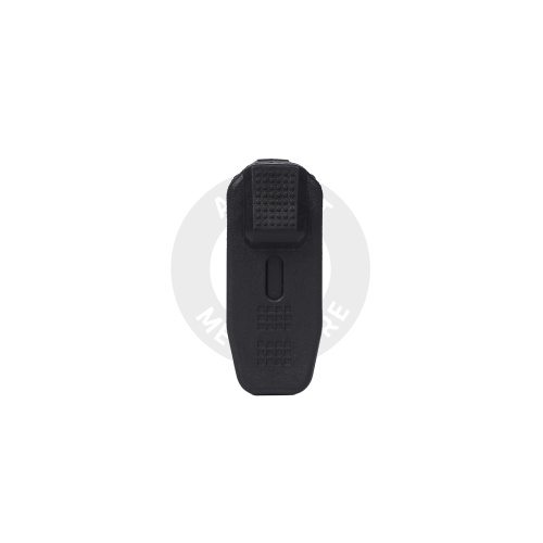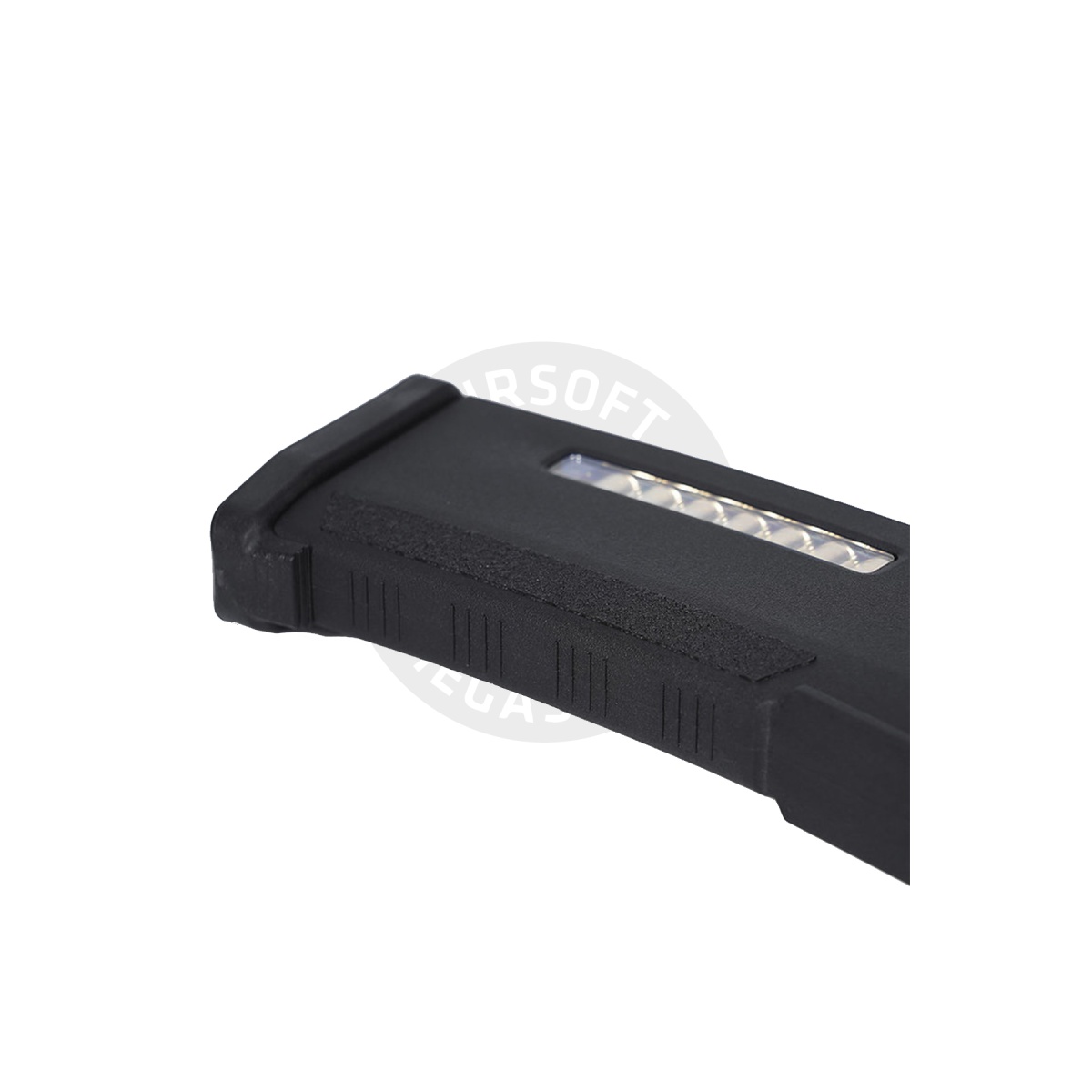 -Angled basepad: The bottom of the base plate has been designed with an angled surface that allows the end user to rest the gun on any flat shooting surface and have more surface contact for greater shooting stability. The angled surface is minimized to the point that it is functional, yet still comfortable in the hand when drawn from pouches and also not inhibit the closure of flaps on closed top magazine pouches. The front of the base plate has also been designed with a ribbed ledge which promotes easier extraction of the magazine from deep magazine pouches and can help the end user with correctly indexing the magazine.