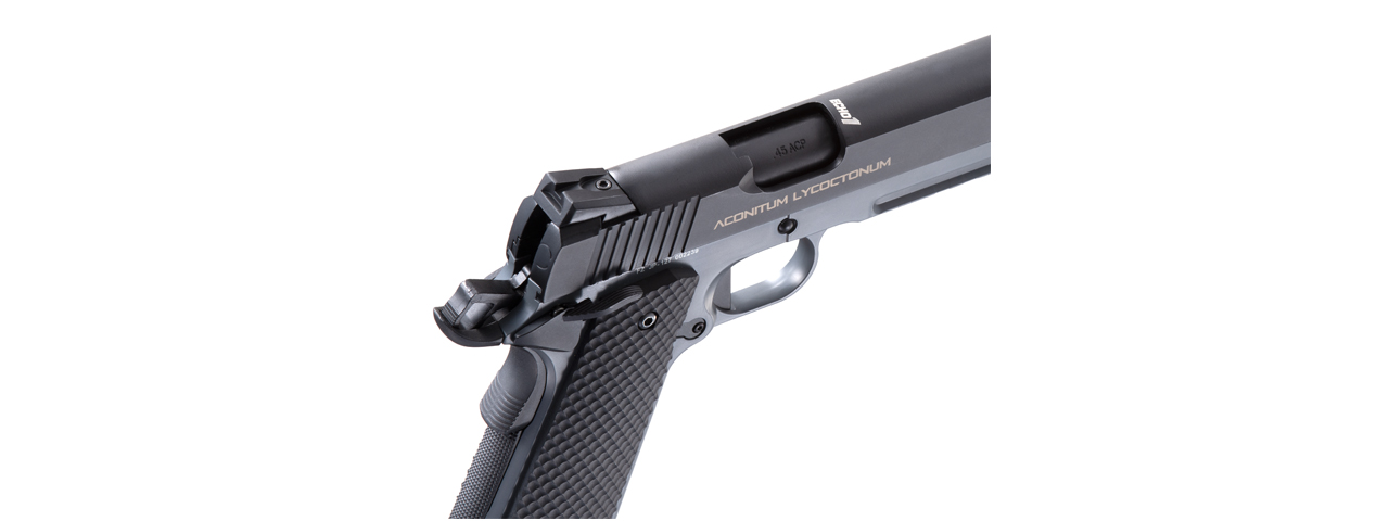 - Metal slide and frame, aggressively styled with a laser-engraved "Wolfsbane" logo