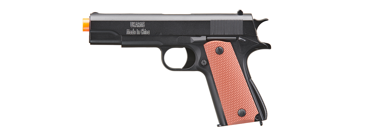 UK Arms 1911 Alloy Series Spring Airsoft Pistol in black with brown grip panels delivers classic styling and simple, dependable operation at a budget-friendly price. Built from a metal alloy slide and frame components paired with polymer parts, this single-shot spring pistol has a reassuring heft that feels close to the real 1911 while keeping overall weight around three-quarters of a pound for easy carry. Power is tuned for casual use at about 200 to 250 feet per second, making it a smart choice for backyard target practice, training reps, and costume or film work where reliability and consistent cycling matter. The spring-powered action is straightforward-rack the slide, press the trigger, and the pistol snaps back into battery ready for the next round. A 12-round magazine supports quick reloads, and the textured brown panels provide a confident grip that looks right at home on a classic profile.