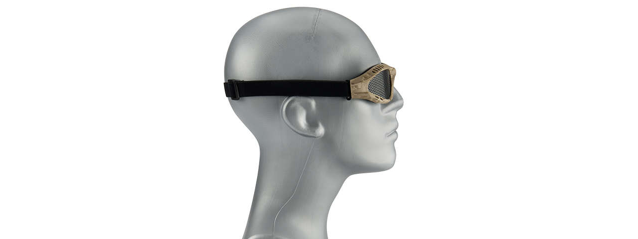 SPECIFICATIONS MATERIAL: POLYMER w/METAL MESH GRILL LENS COLOR: DESERT DIGITAL (HYDRO-DIP) FEATURES ADJUSTABLE ELASTIC STRAPS EVA FOAM PADDING PROVIDES FULL SEAL AND COMFORTABLE WEAR