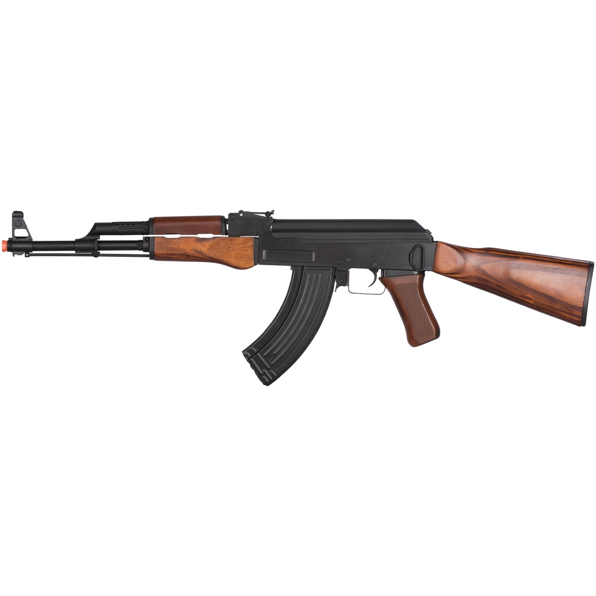 Solid, polished wood furniture with a full metal receiver and barrel assembly make the LCK47 AEG the leading choice for quality and likeness when searching for a true replica of the AK47 rifle. Identical to the AK47 in coloration, weight and dimensions, the frame of this AK rifle has been built using stamped steel with a reinforced full metal top cover. Assembled with a durable 360mm outer barrel, its steel construction ensures your BB fire will fly in a fixed trajectory. The ergonomically designed 6-inch solid wood handguard will make your shots more stable and the pistol grip has been crafted with intersecting lines to further increase ergonomics and handling. The 9.4-inch full stock has also been built from solid wood, allowing you to shoulder your rifle and line-up your shots even more accurately. The wooden furniture on this rifle has been coated with a sleek, glossy finish to reinforce the integrity of the wood and increase its overall look!