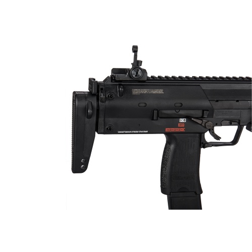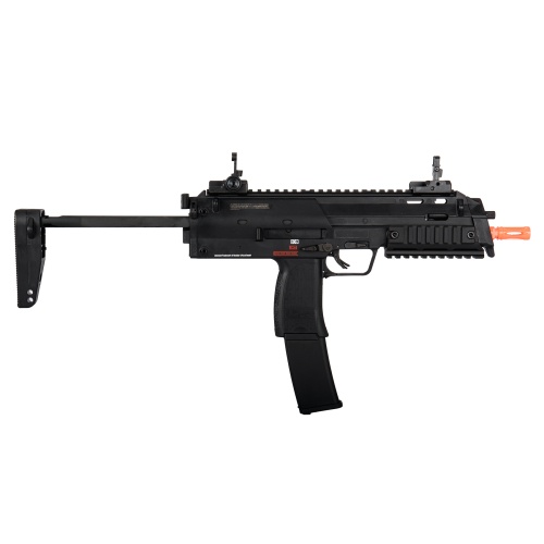 The MP7 has a collapsible stock to allow the gun to be used like a pistol or if you are playing in tight places. There is a single picatinny rail on the top of the gun for optics and 2 more picatinny rails on the left and right side of the gun for flashlights and/or lasers. The top rail also includes iron sights that can be used as low profile sights when folded down, or flipped up for a higher sight, or can also be easily removed.