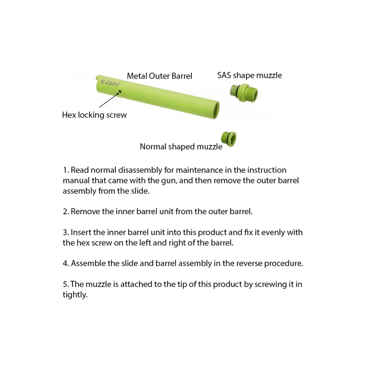 The non-recoiling outer barrel sets the inner barrel using 2 grub screws in order to fix the outer and inner barrels together in order to create a stable firing platform and reducing all movement between the outer barrel and slide (Blowback of the slide still performs normally)