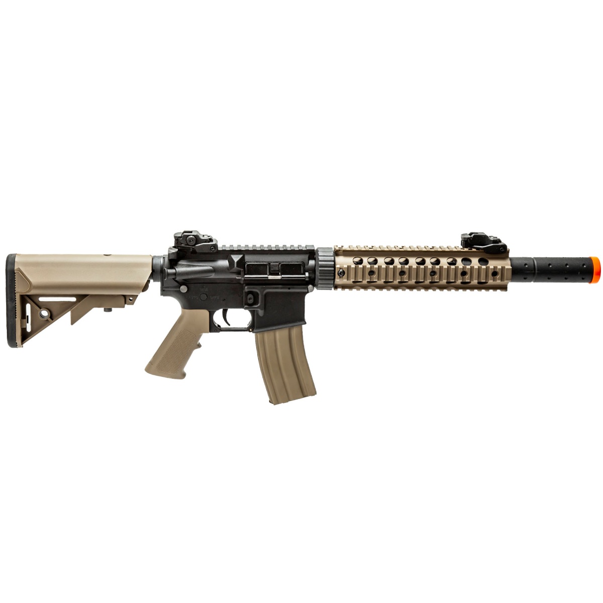 | Build | Full metal gearbox. magazine / Nylon polymer receivers, pistol grip, flip-up iron sights, stock, handguard, mock suppressor |