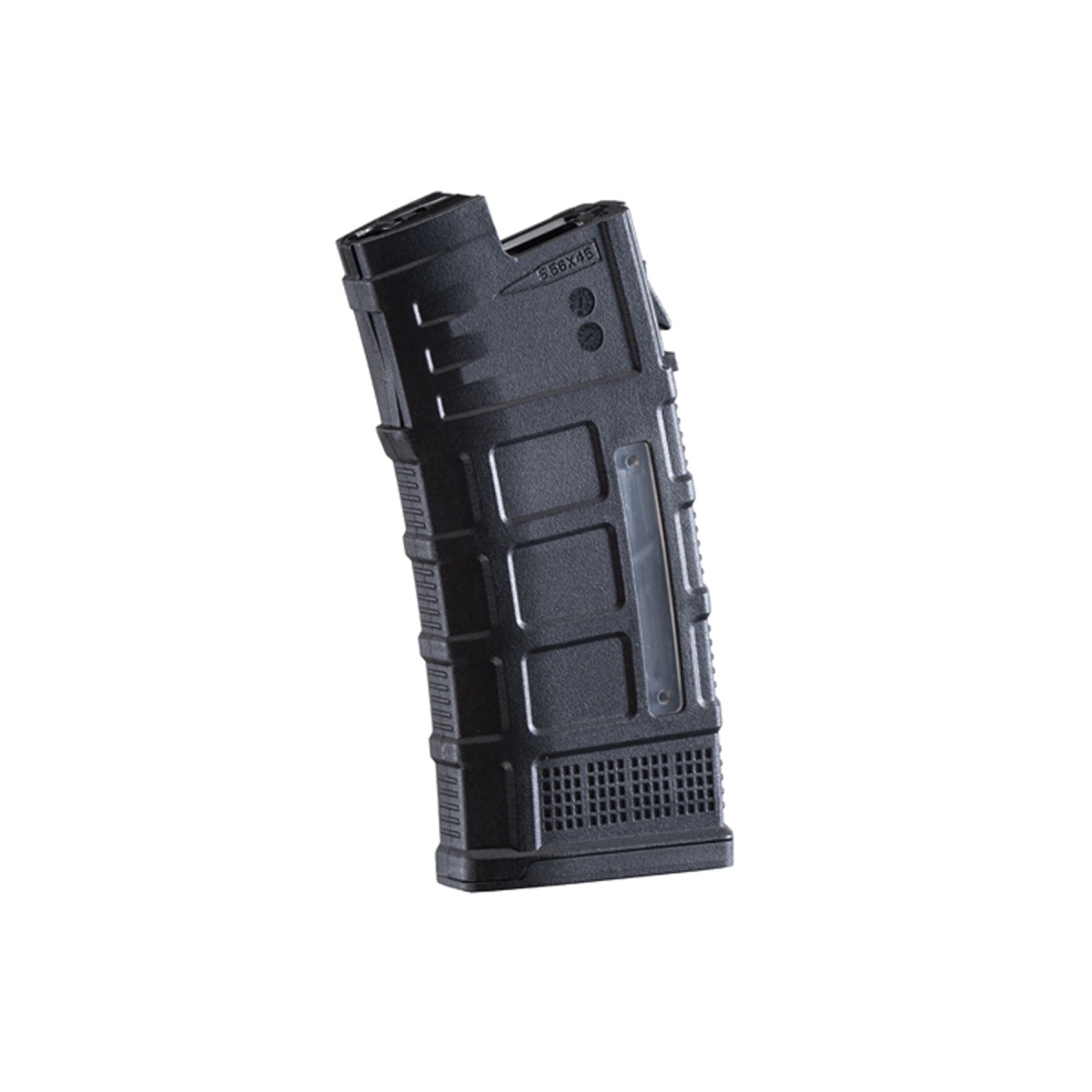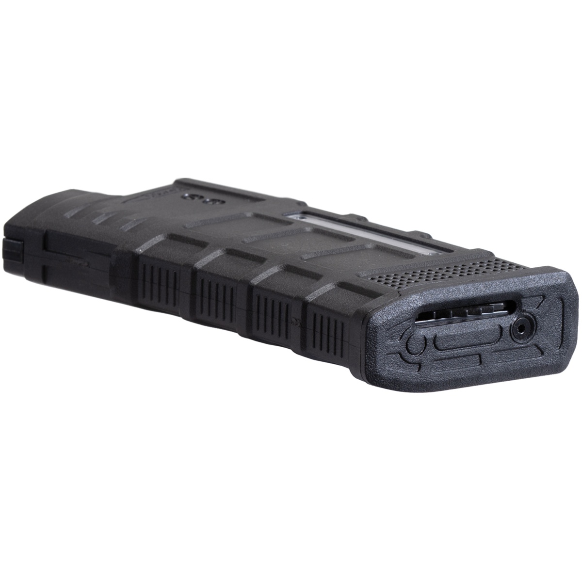 • Windowed side panels to see how many rounds are left in the magazine