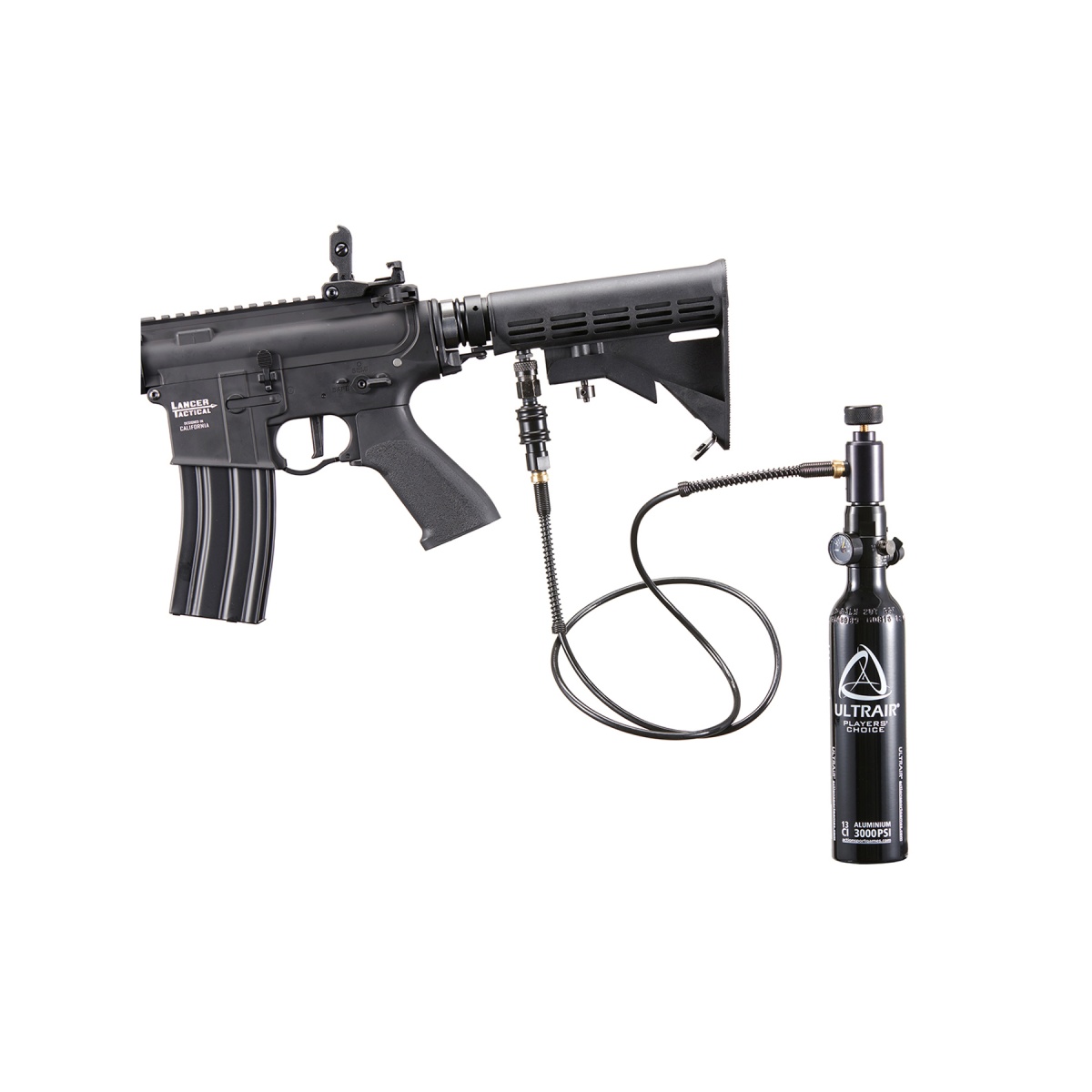 • The air tank is externally mounted with a male line fitting on the buffer tube that will fit most HPA lines
