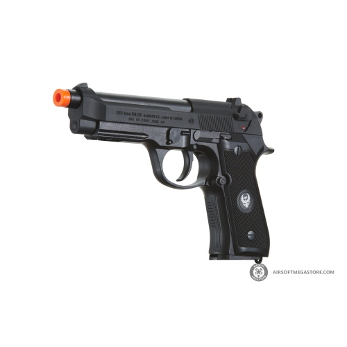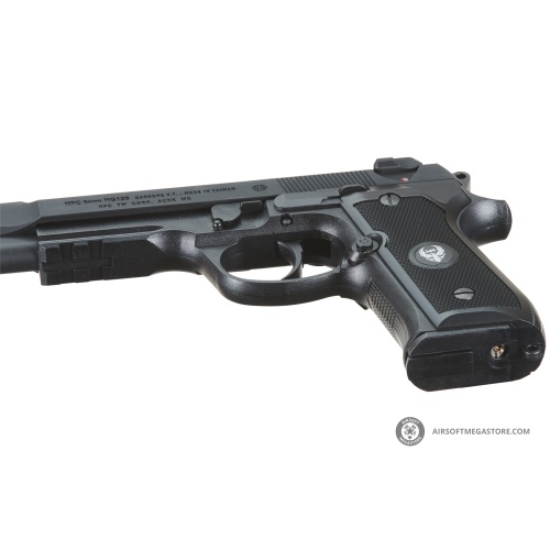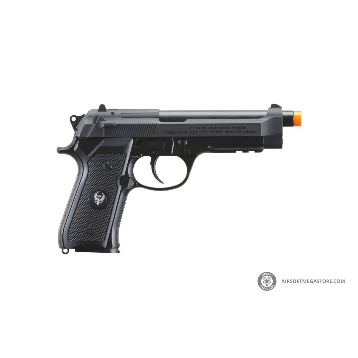Introducing the HFC Metal M9 Green Gas Powered Airsoft Pistol in sleek black, available exclusively on Airsoft Megastore. This pistol combines a polymer construction with metal internals, providing a lightweight and durable design. The green gas non-blowback system ensures excellent gas efficiency, allowing for extended gameplay without frequent refills. The traditional on-slide fire selector switch allows for easy switching between semi-auto and safe modes. With a lower picatinny accessory rail, you can easily attach lights and lasers to enhance your tactical advantage. The built-in front and rear iron sights on the slide facilitate quick and accurate target acquisition. Elevate your airsoft experience with the HFC Metal M9 Green Gas Powered Airsoft Pistol. Get yours today and dominate the field with its reliability and performance.
