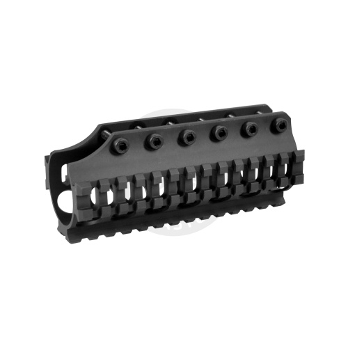The rail uses picatinny and is situated at the 3, 6, and 9 o'clock positions on the rail which makes this perfect for mounting flashlights, fore grips, and peq boxes on your AS VALv