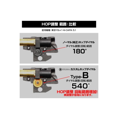 • The Nine ball custom hop up dial adds a much longer groove for much finer hop up adjustment and a relieves the common issue of over hopping