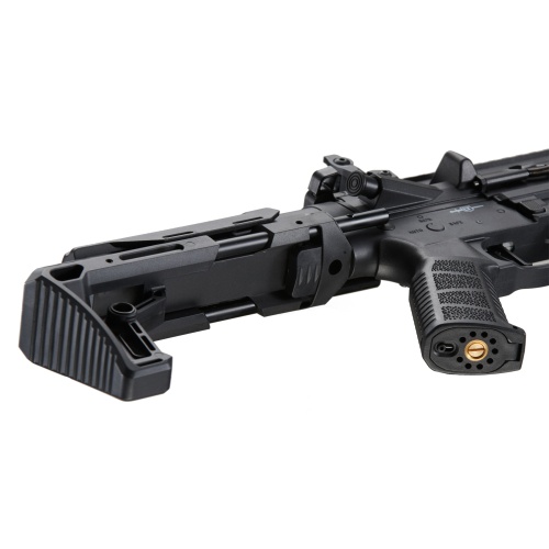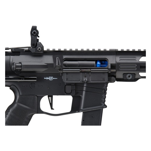 • Extremely compact and lightweight design of the 9mm billet style receiver resembles a traditional M4-type rifle, but the airsoft replica now chambers 9mm magazines versus traditional M4/M16 magazines