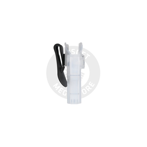 A knurled attachment point on the rear allows the holster to be adjusted in 9 degree increments over a full 360 degrees, allowing for a perfect drawing angle