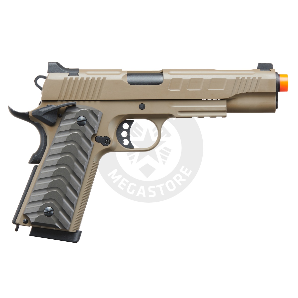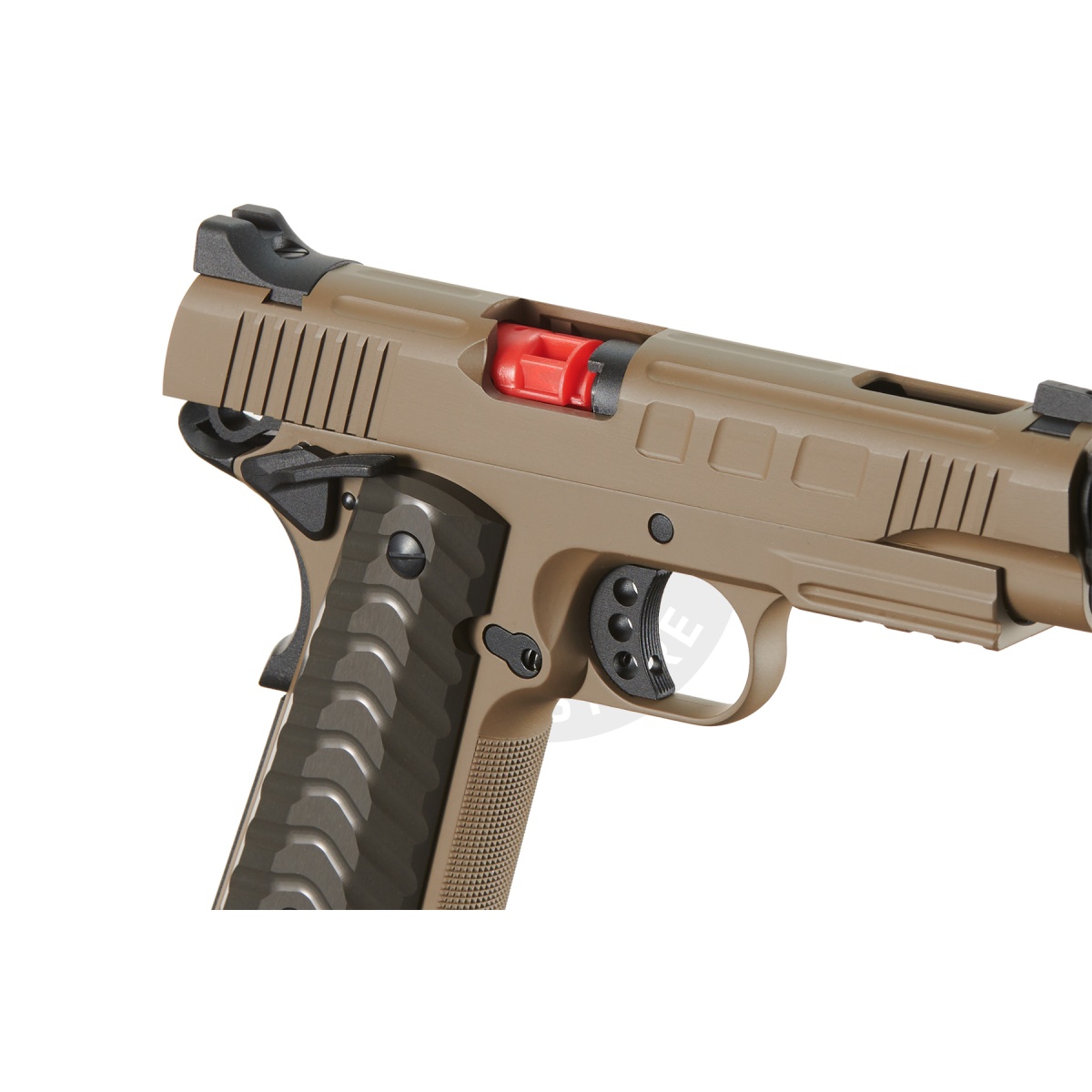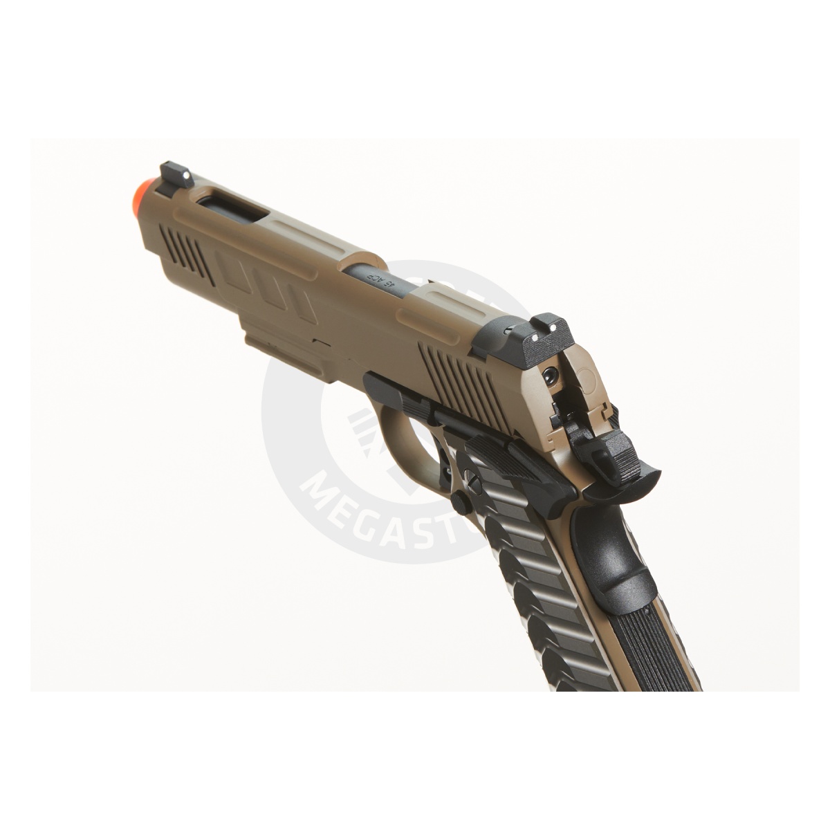 Introducing the KJW Competition Style M45 KP-16 CO2 Gas Blow Back Pistol. Crafted with alloy components for durability and reliability, it offers precise shooting with adjustable hop-up and 320 FPS muzzle velocity. Designed for performance, it features a semi-auto gas blowback system and a 26-round magazine capacity. With its sleek tan color and alloy frame with an accessory rail, it's perfect for tactical use. Whether for competitions or training, this pistol delivers exceptional accuracy and power. Elevate your airsoft game with this top-tier sidearm from KJW, built to dominate the field.