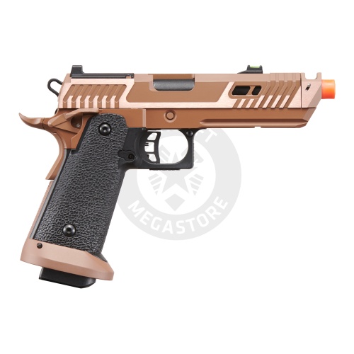 The KLI Sahara Viper CO2 GBB Pistol in bronze is a high-performance sidearm designed for players who demand power, precision, and style in their loadout. Built with a full-metal construction paired with a durable nylon receiver, this pistol delivers both strength and reliability for long-term use. Firing at over 350 FPS, the Sahara Viper provides powerful shooting performance that makes it an excellent choice for competitive play. Its realistic blowback system replicates the feel of a real firearm, offering an immersive shooting experience with every trigger pull. Compact at 220mm in length and weighing just 1090g, the pistol is lightweight enough for quick draws while still maintaining the sturdy build quality expected from a premium gas blowback pistol. With a 112.5mm inner barrel and hop-up system, players can count on consistent accuracy and enhanced trajectory control in every shot. Adding to its practicality, the Sahara Viper comes equipped with a 30+1 round full-metal magazine for extended gameplay without frequent reloads. The pistol also includes three adapter plates, giving users more customization options for optics or accessories, making it adaptable to different playstyles. Compatible with standard 6mm BBs, this CO2-powered pistol ensures consistent velocity and dependable performance across matches. Its sleek bronze finish sets it apart from standard black pistols, giving it a striking, tactical look that enhances any airsoft loadout. Crafted in Taiwan with precision manufacturing, the KLI Sahara Viper blends craftsmanship, durability, and modern design in one package. For players looking for a dependable, powerful, and stylish sidearm that offers both realism and performance, the KLI Sahara Viper CO2 GBB Pistol is a top-tier choice ready to dominate in any airsoft arena.