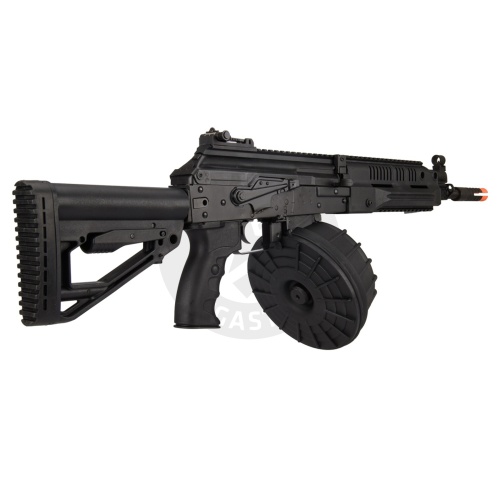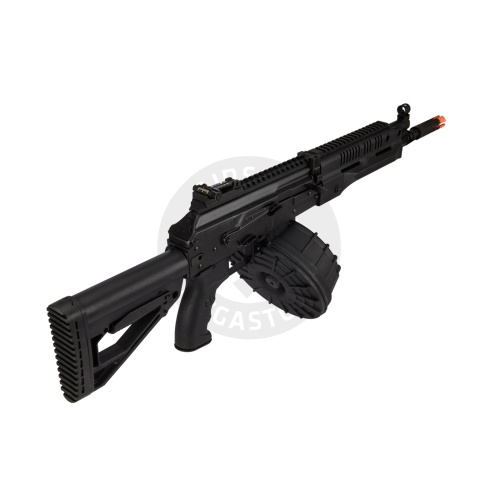 The LCT LCK-16 Steel AEG Rifle with ASTER V2 SE Expert Mosfet and side-folding stock in black is a powerhouse built for serious players who demand performance, durability, and realism. Constructed with a full-steel stamped and riveted receiver, this rifle delivers unmatched authenticity and strength, weighing in at a hefty 10 lbs 6 oz for a realistic field experience. Internally, it features a Version 3 metal gearbox with 9mm bearings, a 400mm brass inner barrel, CNC aluminum cylinder head and piston head, and a steel ball bearing spring guide for reliable operation. The ASTER V2 SE Expert Mosfet elevates performance with advanced electronic control, allowing precise trigger response, improved efficiency, and added protection to the gearbox. Running on an 11.1v 20C lithium polymer battery, the rifle achieves a rapid rate of fire of 22K RPS while maintaining smooth and consistent cycling. With its 2000-round electric winding drum magazine, you'll have sustained firepower to dominate long skirmishes without worrying about frequent reloads. Designed for both realism and modern battlefield adaptability, the LCK-16 is loaded with features that enhance its usability. A redesigned handguard with 20mm Picatinny rails provides ample space for optics, grips, lights, and lasers, while the full-length top rail dust cover allows for easy mounting of scopes or red dots. The side-folding buffer tube stock with a polymer body and QD sling attachment point gives players versatile options for maneuverability and comfort in different environments. A heavy-duty steel barrel, gas piston assembly, front sight, and muzzle further add to its authenticity and ruggedness. With its slide-style hop-up system for accuracy and customizable performance, the LCT LCK-16 offers everything an advanced player needs in a modern tactical AEG. For those who want cutting-edge electronics, heavy-duty steel construction, and unmatched firepower, this rifle is an elite choice ready to lead the battlefield.