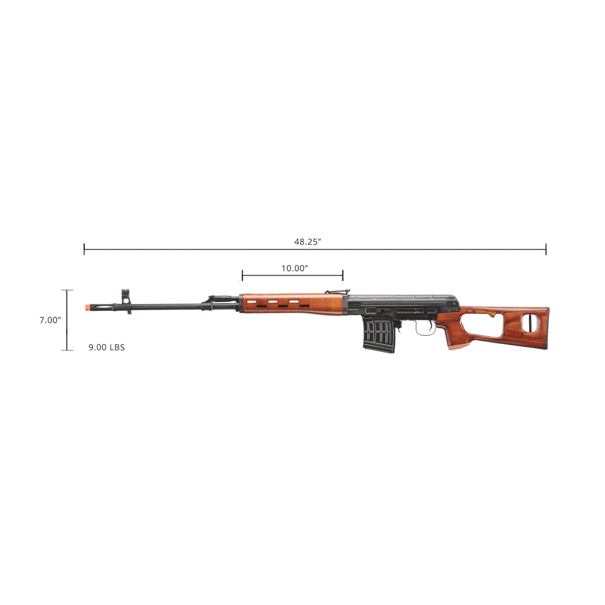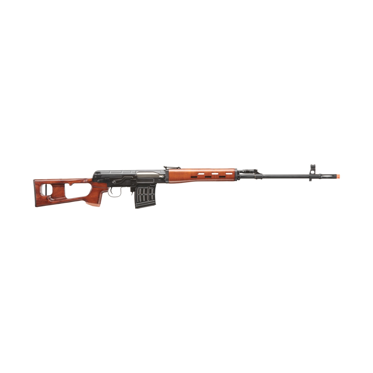 The LCT SVD Dragunov Electric Airsoft Sniper Rifle with real wood furniture is a high-performance, authentic replica built for players who demand precision, realism, and durability. Designed as a 1:1 scale reproduction of the legendary Dragunov SVD, this airsoft sniper rifle combines full stamped steel receivers with laminated real wood furniture for unmatched authenticity and strength. At 48.25 inches in length and weighing 8 lbs 10 oz, it delivers the same heft and balance that marksmen expect from a long-range rifle. The rifle features a 700mm brass inner barrel paired with a metal hop-up chamber to provide exceptional accuracy at extended distances, while its traditional AK-style adjustable leaf rear sight allows for precise target acquisition. Internally, the rifle is powered by an 11.1v LiPo battery and includes high-quality components such as a CNC aluminum cylinder head and piston head, brass chrome-plated cylinder, steel ball bearing spring guide, and MOSFET for efficiency and reliability. Built to perform in competitive airsoft scenarios, the LCT SVD Dragunov is engineered with 9mm bearings for smooth operation and a quick detach spring system for easier tuning to meet field velocity regulations. The 55-round magazine gives players a balance of authenticity and function, while the AK side mount rail provides options for attaching optics to suit your playstyle. The inclusion of a full steel barrel assembly enhances durability and ensures consistent long-range performance, making this rifle a top-tier choice for designated marksman roles. Whether you are a collector looking for a faithful replica of the iconic Soviet sniper rifle or a serious player seeking a long-range platform with power and precision, the LCT SVD delivers professional-grade construction, striking realism, and battlefield dominance. This rifle stands out as one of the most authentic and capable electric airsoft sniper rifles available today.