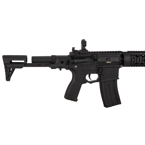 The Lancer Tactical LT-15SBDL-G2 Gen 2 AEG Rifle with PDW stock and mock suppressor in black is a modern, compact, and versatile airsoft rifle designed to deliver both power and maneuverability on the field. Built with durable nylon polymer receivers and a lightweight modular rail interface system, this rifle maintains a balance of strength and reduced weight, making it perfect for extended gameplay. The PDW style retractable stock enhances close-quarters maneuverability, while the included full metal mock suppressor adds to the aggressive tactical design. Internally, this rifle features a full metal Version 2 gearbox equipped with 8mm gear bushings for smooth and reliable performance. The quick-change spring system allows players to easily adjust FPS to meet field regulations, while the rotary hop-up provides consistent accuracy with every shot. Firing at 370-390 FPS with 0.20g BBs, this AEG ensures a solid combination of range and stopping power in both semi and full-auto modes. Designed for adaptability, the LT-15SBDL-G2 includes flip-up front and rear sights for quick target acquisition and a free-float modular rail system for mounting accessories such as grips, lights, and lasers. The 6.03mm tightbore inner barrel paired with a 343mm barrel length further enhances precision, giving players an edge in both indoor and outdoor fields. Its lightweight 4.20 lb frame ensures it is comfortable to carry, while the 300-round high-capacity magazine keeps you in the fight longer without constant reloading. Compatible with a 7.4v LiPo stick battery, this rifle is engineered for consistent performance and dependable firepower. Whether you're engaging in fast-paced CQB battles or outdoor skirmishes, the Lancer Tactical LT-15SBDL-G2 Gen 2 delivers the durability, accuracy, and customization options players demand. This rifle is a must-have for airsoft enthusiasts looking for a reliable and aggressive PDW-style AEG.