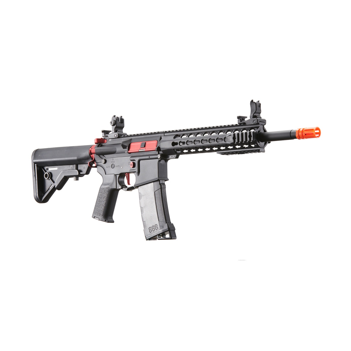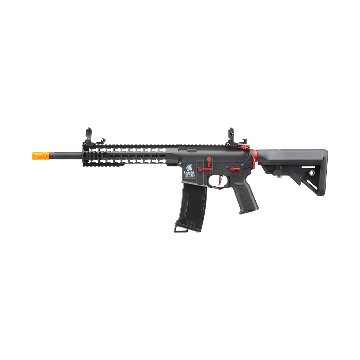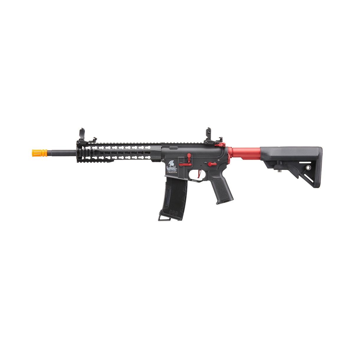 The Lancer Tactical Gen 3 10" Keymod Airsoft M4 Carbine AEG Rifle with red accents is a feature-packed rifle built to deliver performance, customization, and reliability for airsoft players of all levels. Constructed with a lightweight yet durable nylon polymer frame paired with a metal barrel assembly, this AEG balances strength with maneuverability for both indoor CQB and outdoor field play. Internally, it is equipped with a reinforced full metal Version 2 gearbox, 18:1 steel gear set, steel-tooth polycarbonate piston, bearing spring guide, and a 19,000 RPM high-torque motor, providing consistent and dependable power. Firing between 380-400 FPS with the included high FPS spring, or 330-350 FPS with the optional low FPS spring, the rifle gives players the flexibility to adapt to different field requirements. A 6.03mm polished tightbore inner barrel enhances both accuracy and range, while the rotary-style hop-up system allows for easy fine-tuning on the fly. Powered by an 11.1v LiPo battery via a Deans connector, the Gen 3 provides a strong rate of fire and efficiency for competitive skirmishes. The Gen 3 platform also introduces advanced electronics and modern external upgrades to maximize versatility. It features a built-in Zion Arms programmable electronic trigger unit, allowing players to customize their fire modes, including burst options, for faster and more responsive shooting. Externally, the 10-inch Keymod handguard with removable rail sections makes it easy to attach tactical accessories such as lights, lasers, and grips. A full-length 20mm top Picatinny rail provides space for optics or PEQ boxes, while upgraded flip-up front and rear sights add reliable backup aiming options. The retractable stock ensures comfort and adaptability in any battle scenario, and the ergonomic pistol grip with textured panels improves handling. Finished with factory-installed red accent parts for a unique, aggressive look, the Lancer Tactical Gen 3 10" Keymod M4 is an excellent choice for players seeking a modern AEG that combines durability, accuracy, and cutting-edge performance straight out of the box.