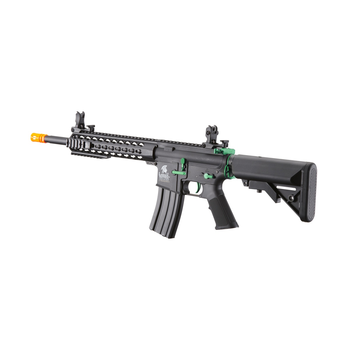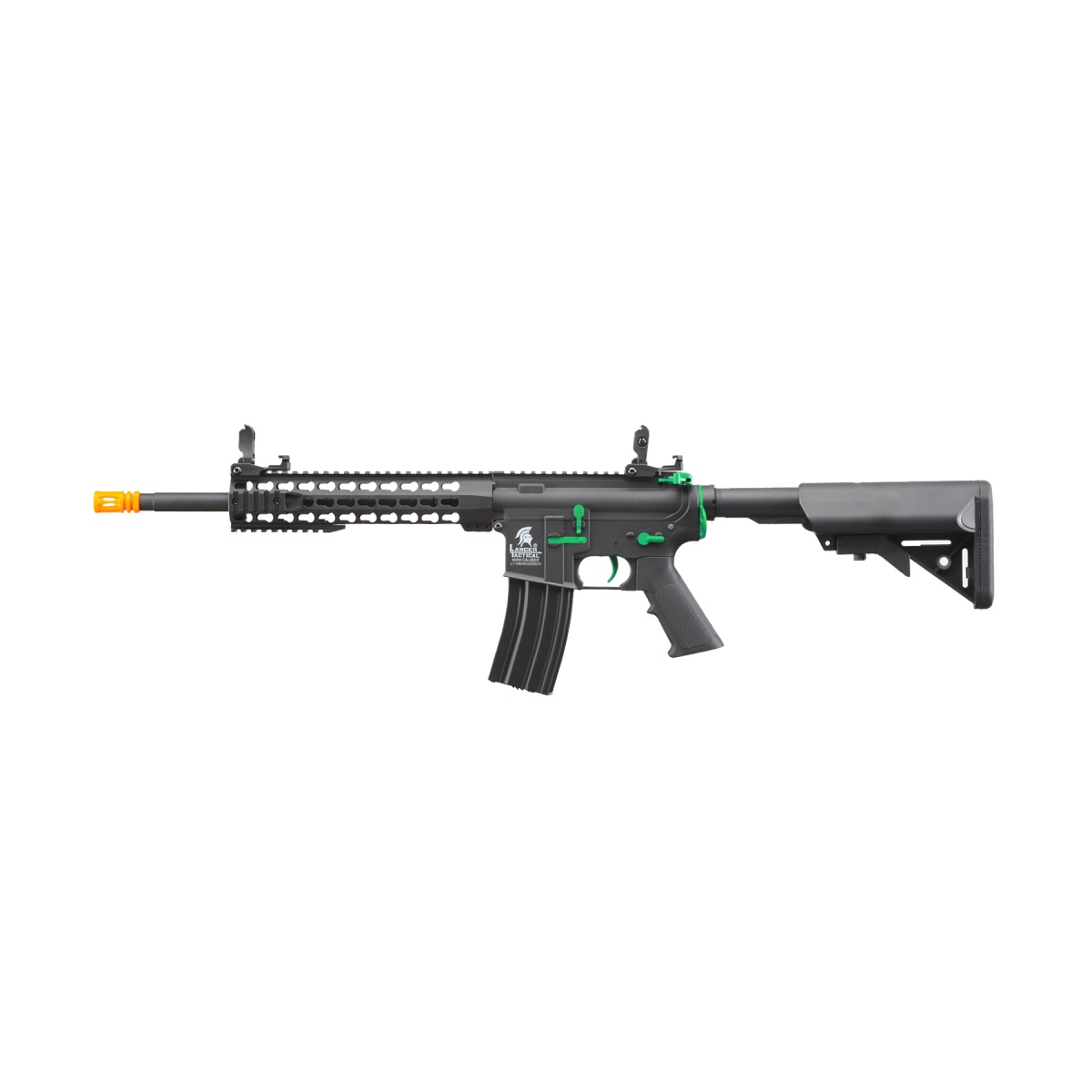 The Lancer Tactical Gen 2 10" Keymod M4 Carbine AEG Rifle in Black with Green accents is a perfect blend of durability, performance, and style, making it an excellent choice for airsoft players of all levels. Built with a lightweight yet highly durable nylon polymer frame and reinforced with a metal barrel assembly, this rifle offers both resilience and ease of handling for extended gameplay. Firing at an impressive 370 to 390 FPS with 0.20g BBs, it is capable of dominating both close-quarters and outdoor engagements. The full metal Version 2 gearbox features a quick-change spring system, allowing players to easily adjust FPS to meet specific field requirements. Equipped with 8mm ball bearings, an 18:1 steel gear ratio, and a high torque 19k RPM motor, this rifle ensures smooth cycling, consistent performance, and reliability in every match. The included 9.6v NiMH nunchuck battery and charger make it ready to go right out of the box. The 10-inch KeyMod handguard provides ample space for customization, while the full-length 20mm Picatinny rail allows users to mount optics, lasers, lights, or PEQ boxes with ease. For improved accuracy and range, the rifle is fitted with a 6.03mm polished tightbore inner barrel, while flip-up front and rear sights provide quick and precise target acquisition. The retractable stock offers multiple adjustments to fit shooters of any size, ensuring comfort and stability in any scenario. With removable 6 and 10 rib rail sections, players can configure accessory placement to their exact needs. The bold green accents give the LT-19 Gen 2 a unique and modern edge, making it stand out on the field. Lightweight, reliable, and versatile, the Lancer Tactical Gen 2 10" Keymod M4 Carbine AEG is an excellent all-around airsoft rifle that combines premium features with an affordable price point, making it a must-have for any serious airsoft enthusiast.