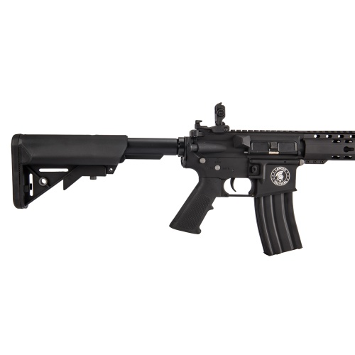 The Generation 2 Lancer Tactical entry level M4 Carbine has an outstanding list of features, taking their already impressive M4 Carbine 10" KeyMod AEG Rifle to the next level with you along with it! The lightweight ABS construction of the Generation 1 rifle has been reinforced with tough nylon polymer, making it able to withstand heavy use in extreme situations and keeping the internals safe and efficient. The full metal outer barrel will not tarnish and ensures a fixed trajectory. The removable carry handle allows you to mount your choice of red dot sights and magnified scopes. This M4 lower FPS AEG is a great airsoft gun for CQB engagements, with a short, carbine length barrel, and a six position retractable crane stock. This high performance upgrade fights off the elements during high intensity play, the only thing you need to fight off are your enemies. Upgraded Gearbox / Internals The Generation 1 rifle included upgraded internals, but Lancer Tactical took the M4 Carbine 10" KeyMod AEG Rifle is a step further to deliver more POW in its power! A quick change spring gearbox can be used to change your FPS from CQB to Outdoor MilSim on a whim, its ported piston head maintains excellent air compression inside the cylinder, and the included 6.03mm tight bore barrel gives you the range and precision you'd never expect from similar AEGs. The upgraded gearbox has even tougher metal gears that are much more efficient than the traditional pot-metal gears. The teeth along the cylinder are metal and the motor has been upgraded to move even faster. The metal inner barrel makes the weapon highly accurate even at longer range targets. The adjustable crane stock enables an easy access battery storage of nunchuck and buffer tube type batteries. Low resistance wiring prevents any damage from high voltage batteries and also makes your trigger more snappy. Right out of the box, the M4 Carbine 10" KeyMod AEG Rifle is a force in combat.