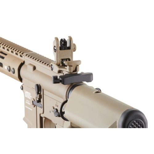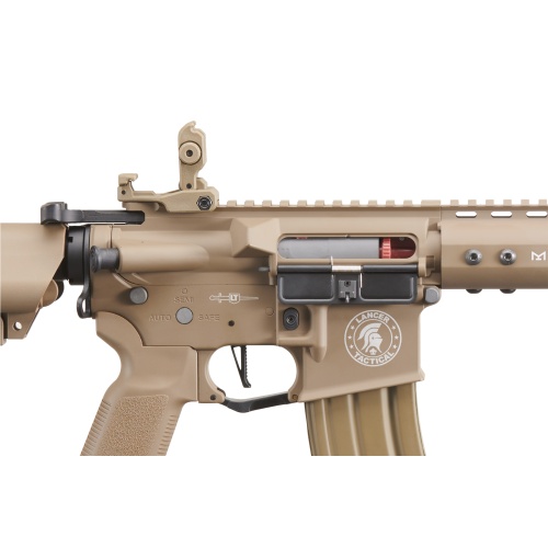 The Lancer Tactical Archon 9 inch M LOK Proline Series M4 Airsoft Rifle in tan is a high performance AEG built for advanced players seeking durability, speed, and tactical flexibility. Constructed with full metal upper and lower receivers, a free float M LOK handguard, and reinforced outer barrel, this rifle offers realistic weight and exceptional durability. Firing at 370 to 380 FPS with 0.20g BBs, the Archon is powered by a full metal Version 2 gearbox enhanced with 8 millimeter bearings, steel 18 to 1 gears, a polycarbonate piston with steel teeth, ball bearing spring guide, and a 25000 RPM neodymium high speed motor. The rotary style adjustable hop up and 6.03 millimeter tightbore inner barrel ensure consistent accuracy and long range effectiveness. Internally equipped with the Lancer Electric Trigger Unit and fire cutoff system, the Archon delivers snappy trigger response, improved cycle rate, and optimized shot control. A quick change spring system allows for easy velocity adjustments, ideal for switching between indoor and outdoor fields. Externally, the licensed M LOK handguard provides ample mounting options for tactical lights, grips, and accessories, while the full length 20 millimeter top rail supports optics, lasers, and magnifiers. The upgraded Gen 3 pistol grip features textured side panels and serrated front and back straps for secure handling. Flip up front and rear sights with quick deploy release come pre installed, and the rear wired small Tamiya connector makes battery installation simple. Weighing only 4.6 pounds and measuring 26.5 to 29 inches, this rifle balances compact size with full sized performance. The Lancer Tactical Archon is a top tier choice for competitive players looking for a rugged and reliable M4 AEG platform with modern features and aggressive styling.