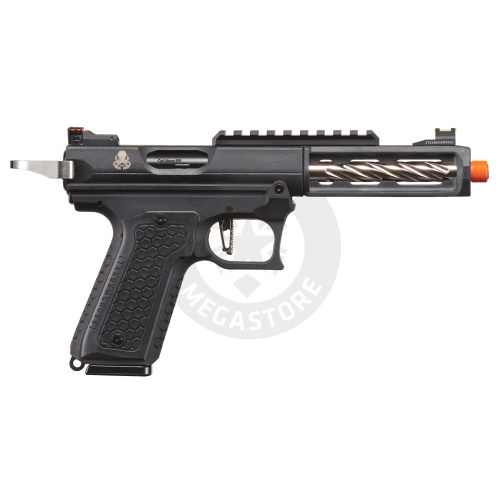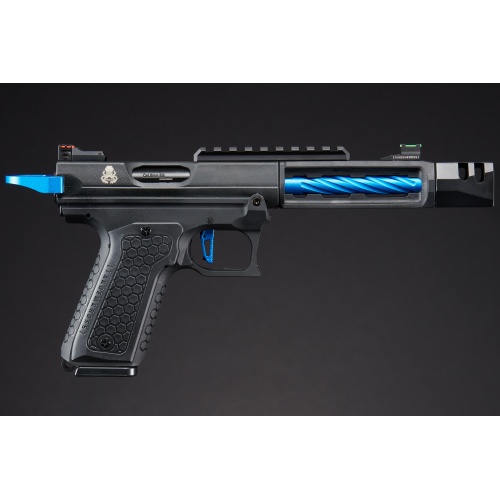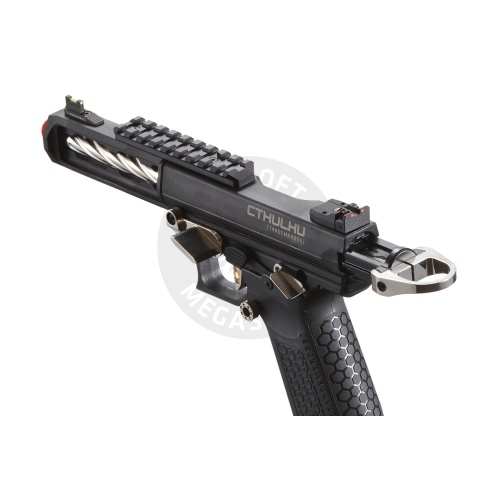 The Tandemkross CTHULHU Gas Blow Back Pistol combines competition ready ergonomics with practical field performance for players who want a high quality GBB sidearm. Built from durable polymer the pistol features a Game Changer Pro Squared Compensator included for reduced muzzle rise and faster follow up shots. The package also includes a CNC thumb rest and safety plus a skeletonized competition trigger for a crisp and predictable pull. Tandemkross Hivegrip texture and a magazine release positioned for speedy reloads make this pistol comfortable and intuitive to run during rapid action. Sights are premium with an Eagle Eye fiber optic front sight and an adjustable Eagle Eye fiber optic rear sight for fast target acquisition in varied light. The Halo charging ring enhances slide manipulation while the overall length of 254 mm and 130 mm inner barrel deliver a compact profile with stable performance. Magazine capacity is 24 rounds and the pistol achieves roughly 310 to 330 FPS with 2.0 g BBs when tuned to match field regulations.
