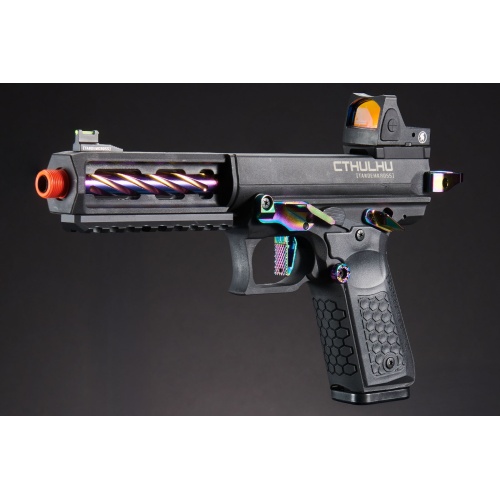 The Tandemkross CTHULHU Gas Blow Back Pistol combines competition ready ergonomics with practical field performance for players who want a high quality GBB sidearm. Built from durable polymer the pistol features a Game Changer Pro Squared Compensator included for reduced muzzle rise and faster follow up shots. The package also includes a CNC thumb rest and safety plus a skeletonized competition trigger for a crisp and predictable pull. Tandemkross Hivegrip texture and a magazine release positioned for speedy reloads make this pistol comfortable and intuitive to run during rapid action. Sights are premium with an Eagle Eye fiber optic front sight and an adjustable Eagle Eye fiber optic rear sight for fast target acquisition in varied light. The Halo charging ring enhances slide manipulation while the overall length of 254 mm and 130 mm inner barrel deliver a compact profile with stable performance. Magazine capacity is 24 rounds and the pistol achieves roughly 310 to 330 FPS with 2.0 g BBs when tuned to match field regulations.