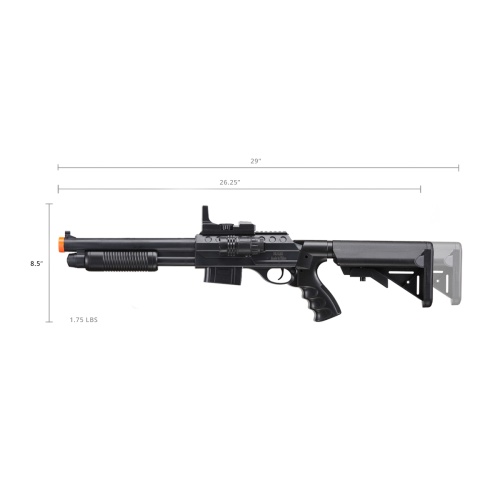 The UK Arms M0581D Pump Action Shotgun with Scope and Light is an excellent choice for airsoft players looking for a dependable and versatile spring-powered shotgun. Constructed from durable ABS plastic, this shotgun is both lightweight and rugged, making it ideal for fast-paced skirmishes while remaining comfortable to carry for extended games. Its realistic pump action adds to the immersive shooting experience, while the built-in foregrip makes chambering follow-up shots quick and efficient. Firing at a muzzle velocity of 300 FPS with 0.12g BBs, the M0581D delivers reliable performance in close to mid-range encounters. The shotgun features a single-shot firing mode with a large 100-round reservoir magazine, ensuring that players spend more time in the action and less time reloading. At just 3 lbs and measuring 30 to 33 inches in length, this shotgun is lightweight yet effective for CQB and field use. Packed with practical features, the UK Arms M0581D also includes an adjustable M4-style crane stock with three positions, allowing players to customize the fit for comfort and stability. The grooved pistol grip provides excellent control, even when wearing gloves, while the included scope and flashlight enhance visibility and target acquisition in various lighting conditions. Its sleek black finish adds a tactical look, making it a strong visual addition to any airsoft loadout. Perfect for players who want an affordable yet functional shotgun, the UK Arms M0581D Pump Action Shotgun with Scope and Light combines durability, style, and performance in one complete package. Available now, it is a must-have option for beginners and experienced players who want a reliable spring-powered airsoft shotgun with useful accessories included right out of the box.