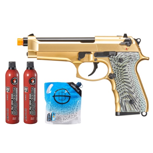 WE-Tech New System M92 Eagle Full Auto Airsoft Gas Blowback Pistol - (Gold) Green Gas Combo