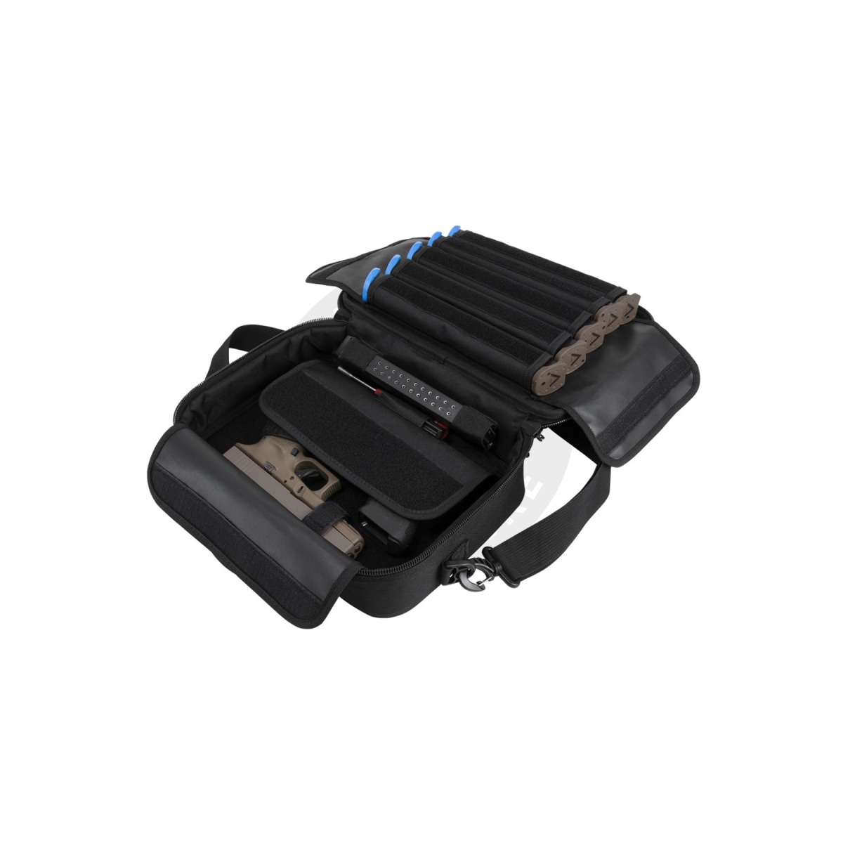• The Main Pistol Compartment can fit two standard full framed semi-auto pistols. The compartment floor is lined with loop fasteners and comes with four hook & loop straps to secure the pistols in place. There are two large flaps that close over the pistols to help secure them in place and to protect them from being scratched.