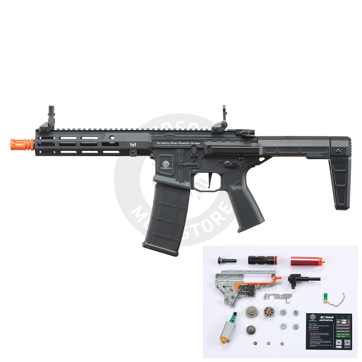 Introducing the Poseidon Punisher PDW AEGR Rifle and advanced Medusa App Based Programmable Mosfet, a game-changer for airsoft enthusiasts seeking precision and power. Crafted with a durable nylon and fiber body, this lightweight yet impact-resistant weapon boasts a slew of features. The ambidextrous selector switch adds versatility. Quick spring release, ergonomic non-slip grip, and a batwing charging handle enhance control and speed. The 8mm Gearbox V2 with high-strength bearings guarantees durability. With a 220-round AEG M4 Midcap Magazine, this Poseidon masterpiece is your key to dominance. Elevate your airsoft game and own the battlefield. Available in sleek black, it's time to redefine your playstyle with Poseidon's Punisher PDW.