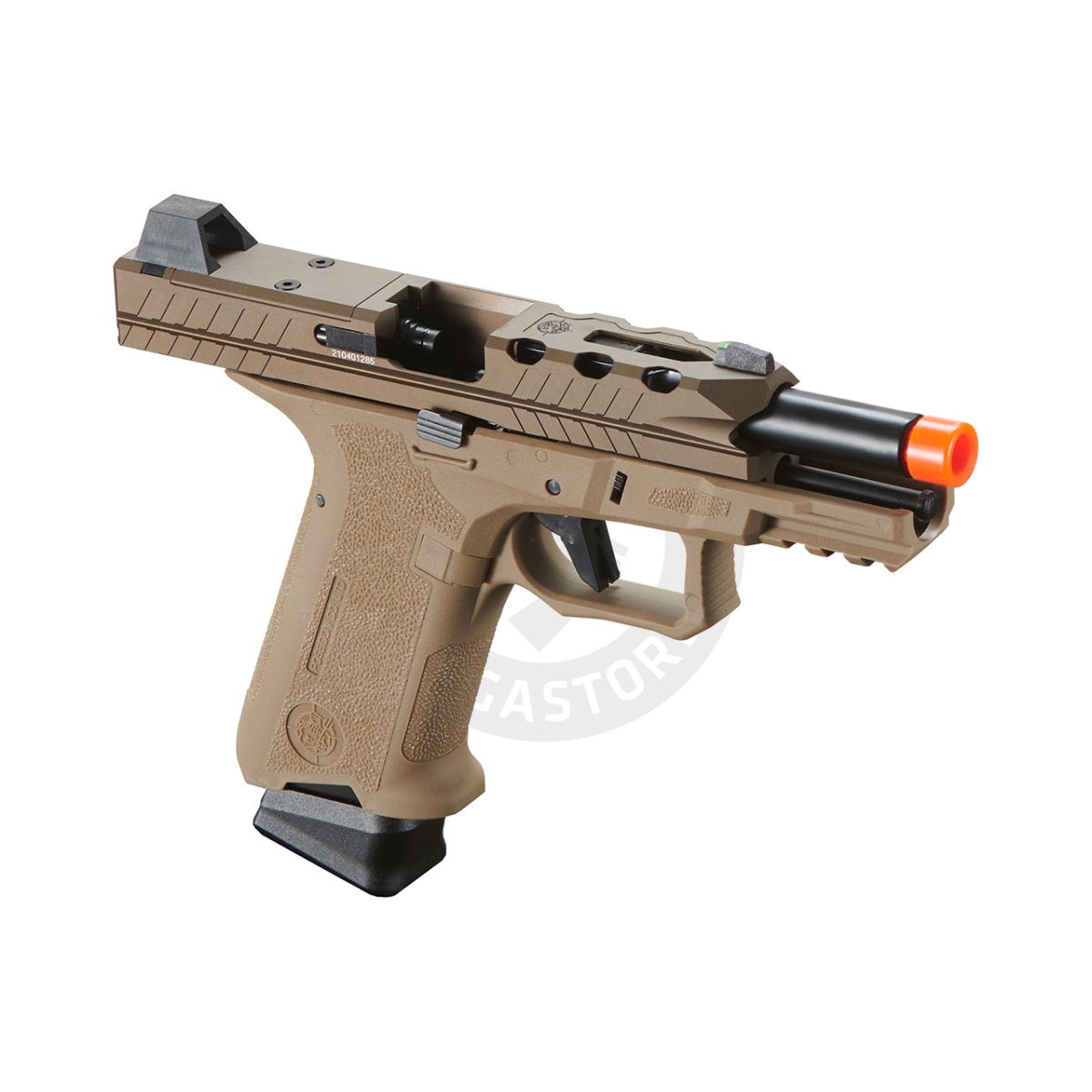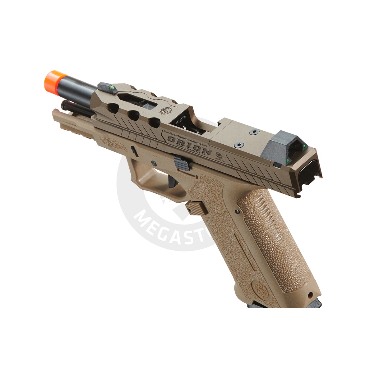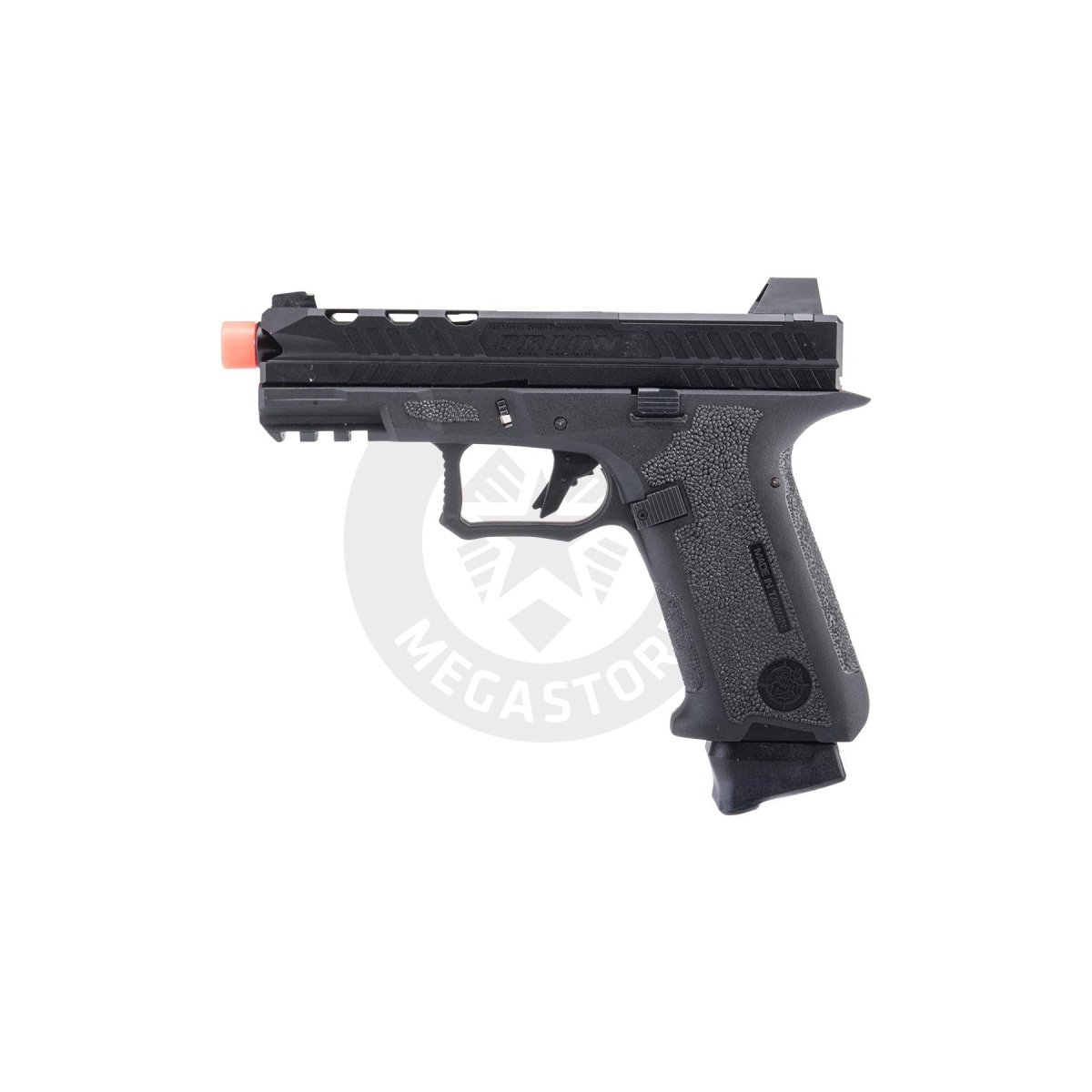 Introducing the Poseidon Orion Performance Series GBB Pistol No.1, a top-tier sidearm designed for maximum comfort and superior performance. Crafted with a CNC-machined 7075 Aluminum slide and a polymer Orion lower frame featuring a shark scale grip for optimal control. Built on Poseidon's proprietary system, it outperforms Marui or WE systems. The integrated semi/full auto selector hidden in the slide, upgraded hop-up with air cushion inner barrel, and frame-mounted rail for accessories make it a versatile choice. With enhanced "Cyclops" iron sights and RMR compatibility, this pistol delivers a superb sight picture. Elevate your gameplay with this high-quality, customizable sidearm.