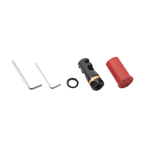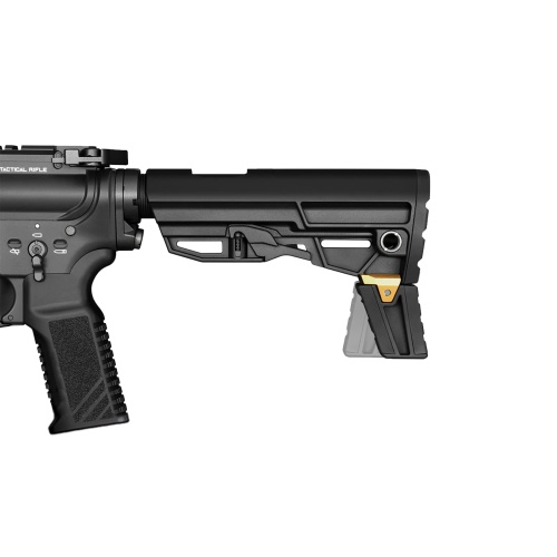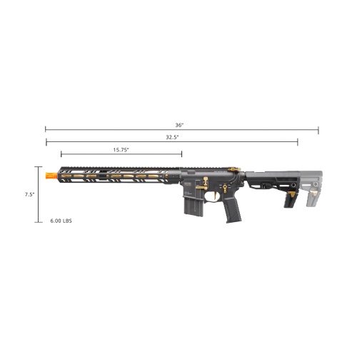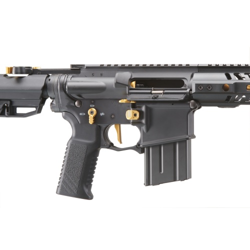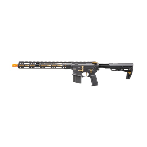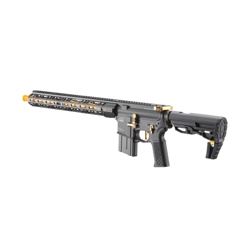 The Tokyo Marui MTR16 G Edition Gas Blowback Airsoft Rifle in black and gold is a high performance platform built for players who want realism, reliability, and standout style. Powered by green gas and featuring Tokyo Marui's Z System, this rifle delivers consistent power, excellent gas efficiency, and long term durability. Firing at 280 to 300 FPS with 0.20g BBs, the MTR16 G Edition supports semi automatic, full automatic, and safe firing modes. Its realistic blowback system replicates the feel and function of a real steel AR platform, while the 20 round magazine keeps reloads immersive and mission focused. Compatible with Tokyo Marui Z System and MWS mags, this rifle fits seamlessly into any gas blowback loadout. Crafted from a blend of polymer and aluminum, the MTR16 G Edition is both lightweight and solid, weighing in at 5.9 pounds. The black and gold color scheme sets this rifle apart visually, with gold accent parts and a twisted outer barrel giving it a bold, aggressive look. The full length M LOK handguard offers ample space for attachments like grips, lights, and lasers, and the 14 millimeter negative thread is ready for suppressors or tracer units. Ambidextrous controls and a vertical angle pistol grip ensure comfort and adaptability for left or right handed users. The modular stock can be adjusted for comfort across a variety of positions, and the durable Cerakote finish resists scratches and corrosion for long term use. Ideal for competitive players or collectors looking for a premium GBB rifle with authentic performance and high end visual appeal, the Tokyo Marui MTR16 G Edition is a top choice that delivers in both function and form.