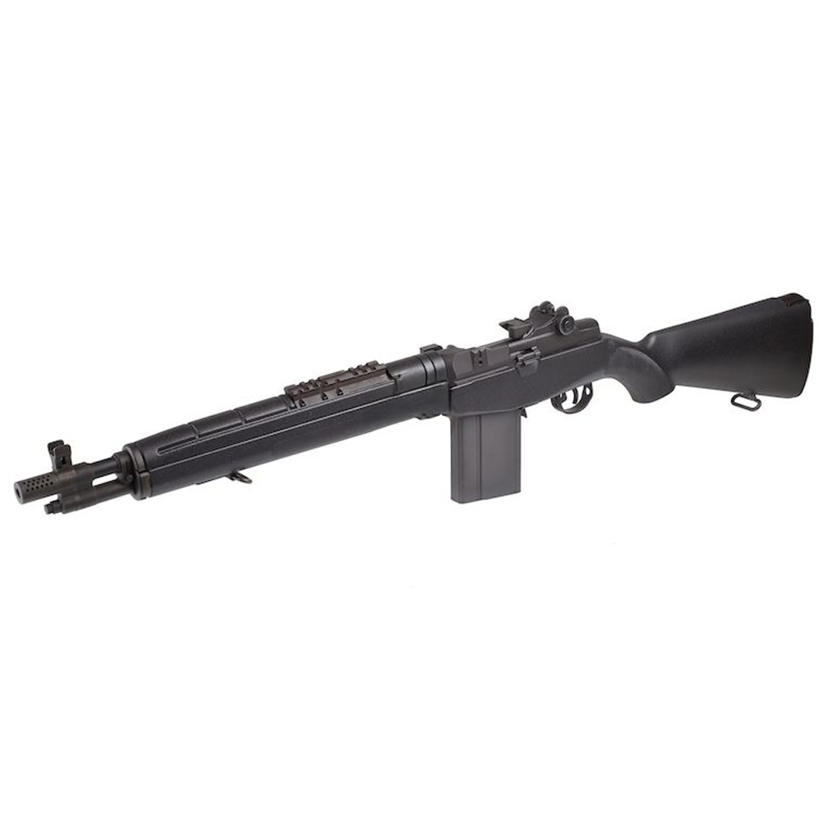 The Tokyo Marui M14 SOCOM AEG Airsoft Gun is a compact and high-performance take on the classic M14 platform, designed for serious players seeking realism, durability, and power. Built with Tokyo Marui's renowned internal quality, the M14 SOCOM features a Version 7 gearbox paired with a reliable EG700 motor for smooth semi and full-auto operation. Its short-barrel configuration with a micro ported muzzle brake makes it ideal for close- to mid-range engagements, and the 14mm CCW threaded outer barrel allows you to customize it with a suppressor or tracer unit. With an adjustable hop-up and 420mm precision inner barrel, this rifle delivers tight groupings with standard 6mm BBs, offering impressive accuracy and consistency right out of the box. Externally, the M14 SOCOM sports a sleek black finish and a durable sandstone-style stock and handguard for a tactical look and enhanced grip. The rear-wired battery system (Type 01 Large battery, not included) and Tamiya connector keep things secure and easy to manage in the field. It's loaded with thoughtful design features like a scout-style optics rail for easy mounting and SOCOM-marked operation rod for authentic detailing. Weighing 3650g and measuring 946mm in length, this AEG balances a full-size rifle feel with maneuverability. The included 70-round midcap magazine offers realistic capacity and reliable feeding, compatible with all Marui M14 mags. Whether you're a MILSIM player, collector, or weekend warrior, the Tokyo Marui M14 SOCOM delivers premium performance with Tokyo Marui's legendary craftsmanship-making it a standout option for any airsoft loadout. A top-tier electric airsoft rifle for those who value heritage, precision, and reliability in every shot.