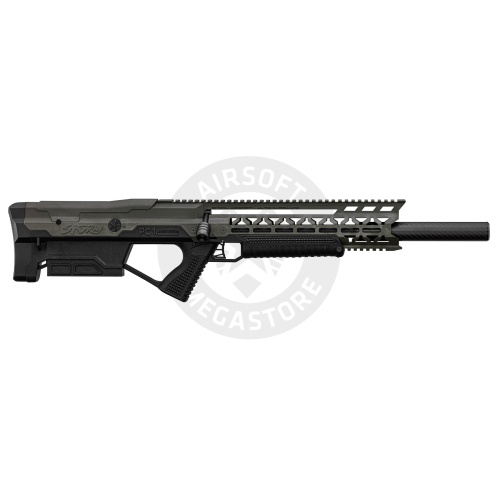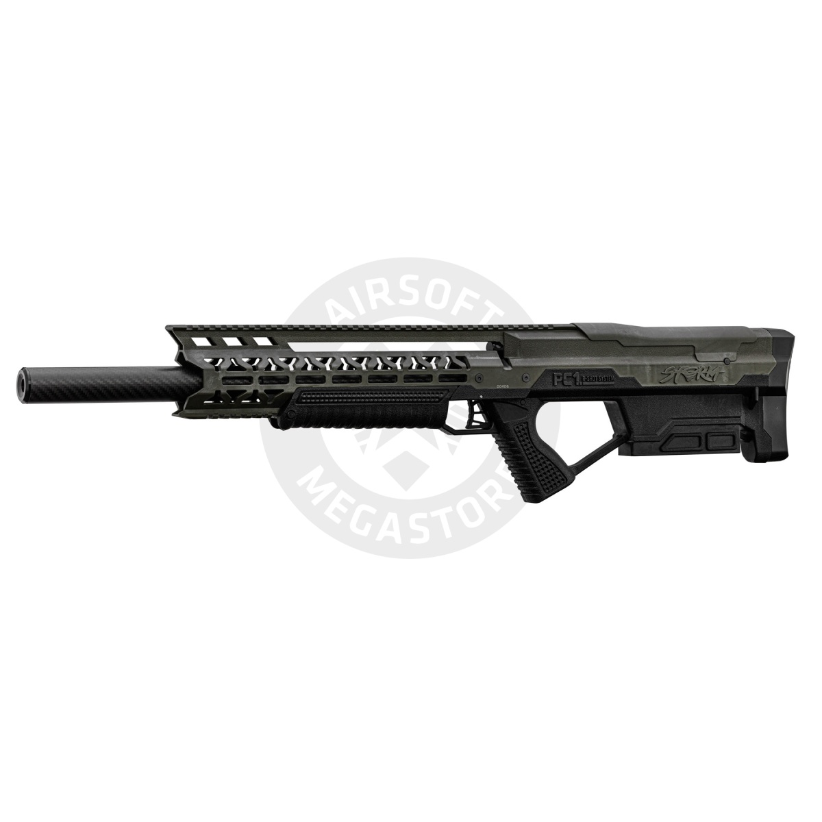 The Replica PC1 Storm Pneumatic Short in OD Green is a compact powerhouse designed for airsoft players who demand precision, stealth, and advanced performance in a small form factor. Built from lightweight polymer and weighing only 1.6 kilograms, this ultra compact bullpup sniper rifle is engineered for mobility without sacrificing accuracy. With three selectable power levels ranging from 400 to 445 FPS, it offers consistent long range capability with less than 5 FPS variation. The integrated 417 millimeter inner barrel delivers superior range and tight groupings right out of the box, while the minimalist design and compact build make it perfect for recon and mobile sniper roles. Designed and assembled in France, the PC1 Storm features the revolutionary R Shot System, eliminating traditional components like springs and pistons in favor of an ultra reliable and silent pneumatic firing mechanism. The result is a virtually inaudible shot with extreme durability and nearly zero power fluctuation. Compatible with VSR 10 magazines and hop up parts, this sniper is easy to maintain and upgrade. A notched external hop up adjustment dial allows for precise tuning on the fly, and the power level can be quickly changed without disassembly. The modular body supports external customization, allowing players to build a personalized sniper platform tailored to their needs. With its OD Green finish, advanced internals, and field ready performance, the Replica PC1 Storm Pneumatic Short sets a new benchmark for compact snipers in the airsoft world. Whether you're engaging from cover or closing in on high value targets, this rifle offers quiet precision and unmatched portability for elite level gameplay.